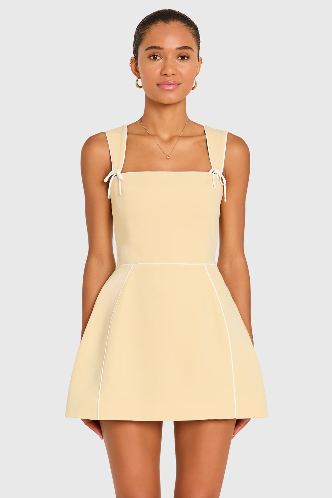 Step out looking effortlessly chic in the Baylee Romper. This softly structured mini romper features a flattering straight neckline and delicate tie shoulder straps that add a sweet, feminine touch. The fitted bodice flows into a playful flared skort-style bottom, giving you the polished look of a dress with the comfort of shorts. Perfect for brunch, weekend outings, day parties, vacations, and summer date plans.
