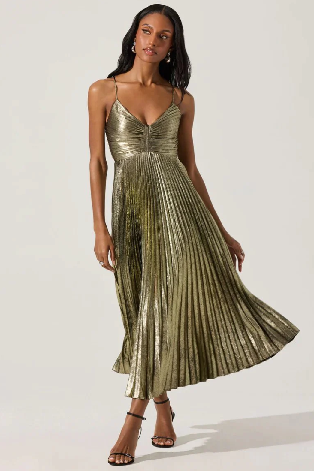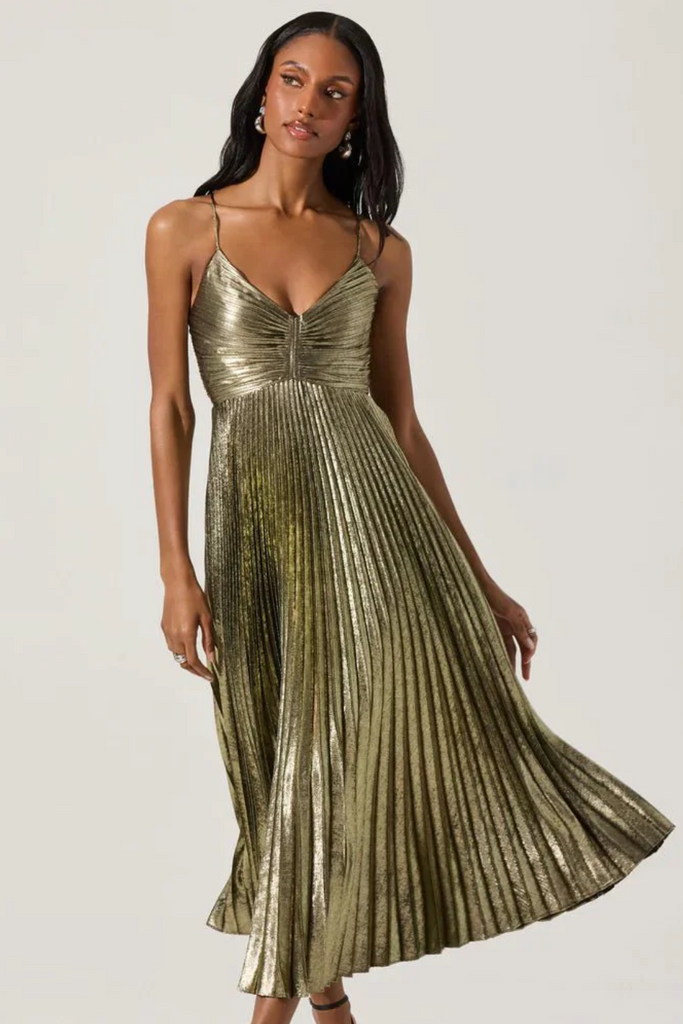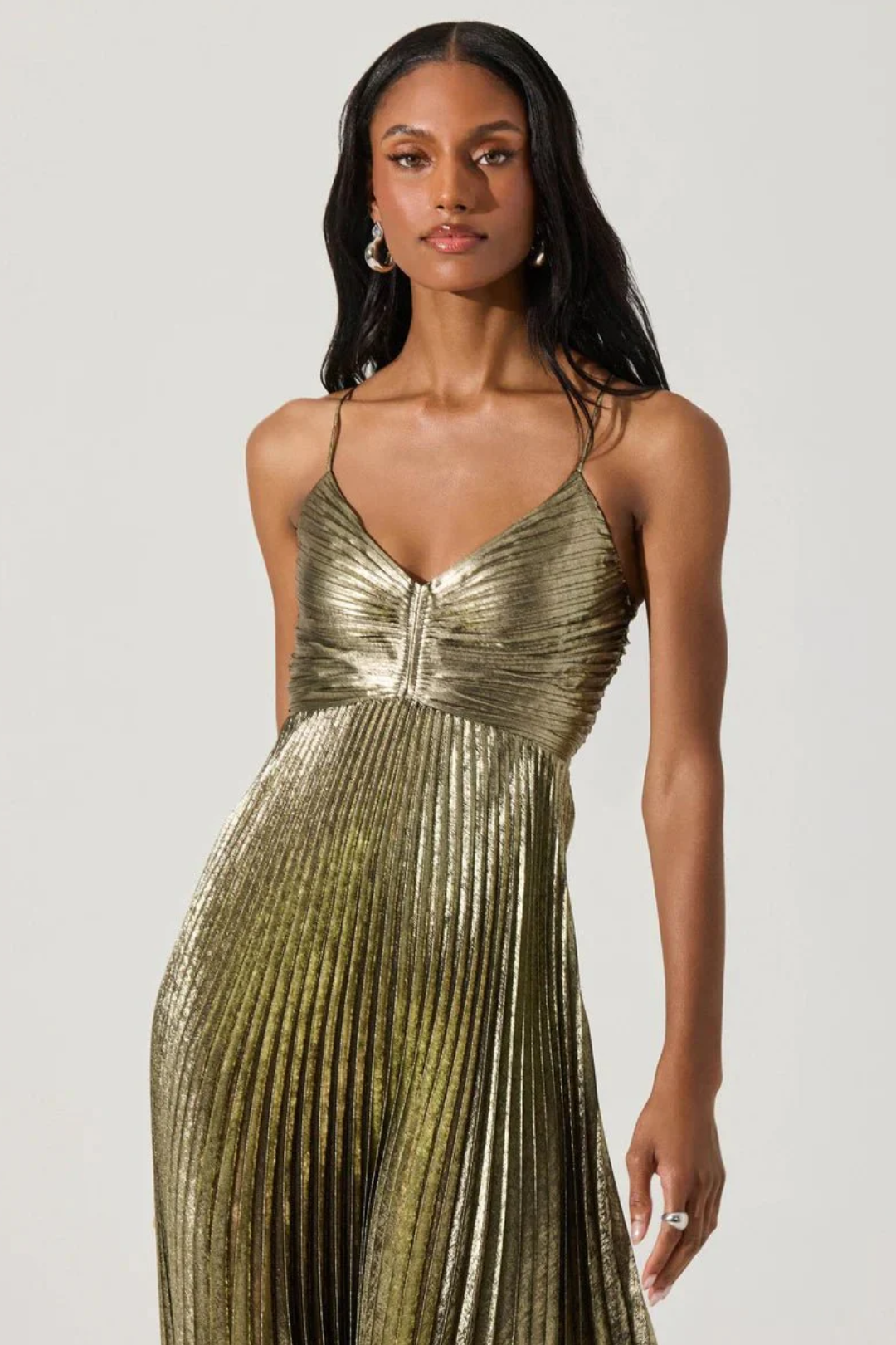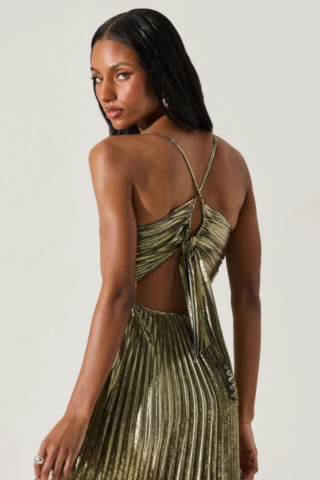 A modern showstopper with timeless allure, the Blythe Dress in Black Gold turns every entrance into a moment. Crafted from metallic plisse with delicate straps, allover pleats, and subtle cutout tie-back. Perfect for weddings, evening dates, or cocktail events.