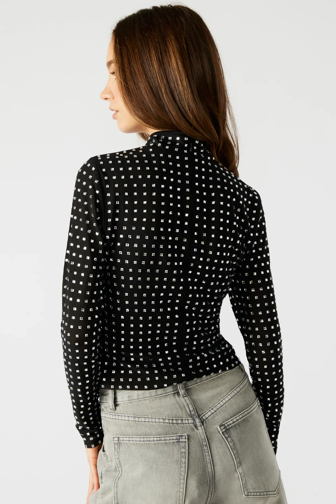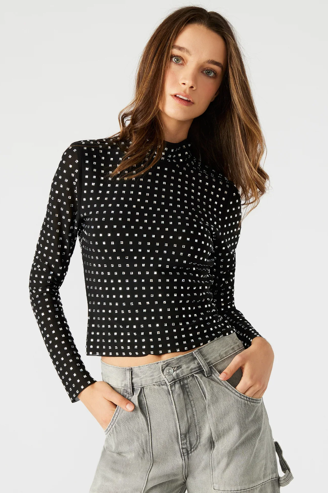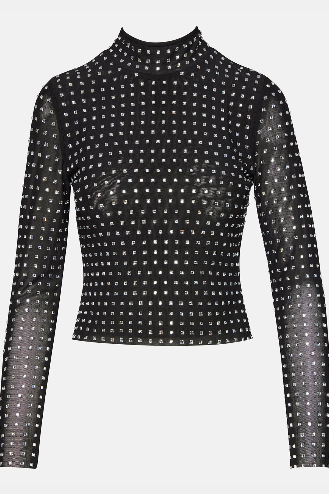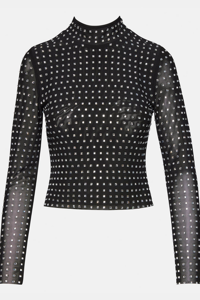 All eyes on you in this effortlessly glamorous Melvina Top. Designed in black mesh with a chic mock neckline and long sleeves, this top stands out with all-over square rhinestone embellishments that catch the light just right. Its sheer fabric adds a touch of edge while still keeping it refined, making it perfect for anything from a night out to layering under a blazer for an elevated vibe.