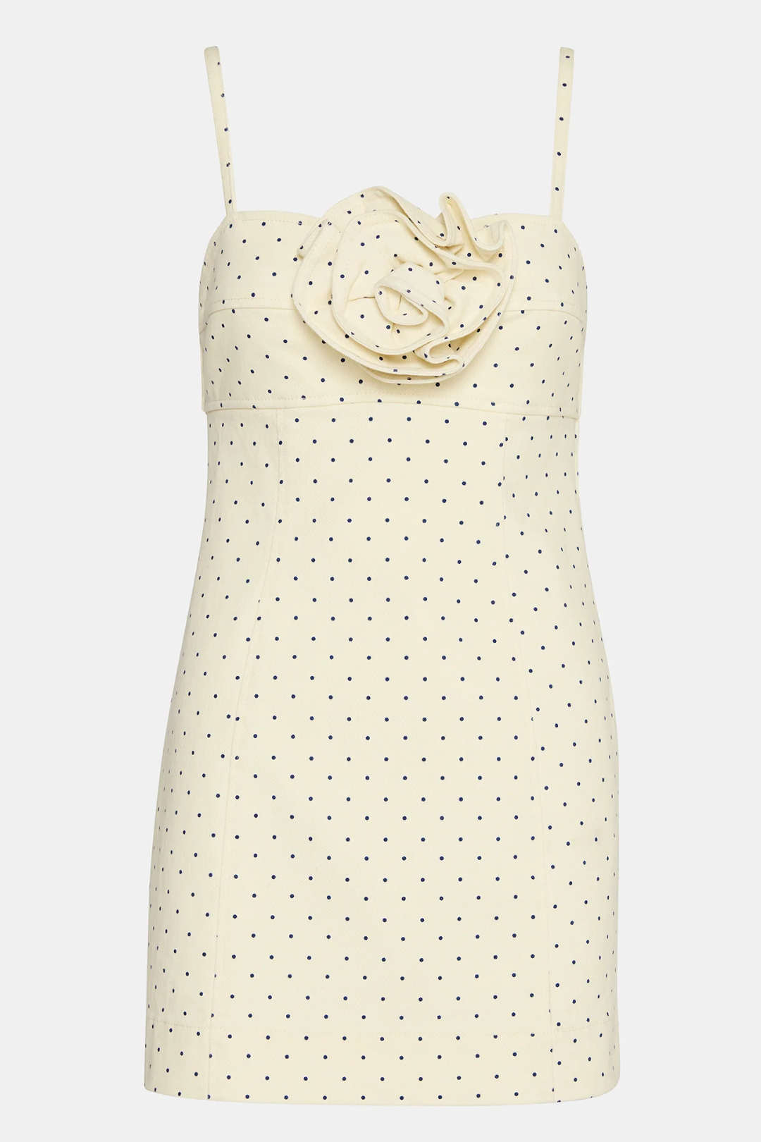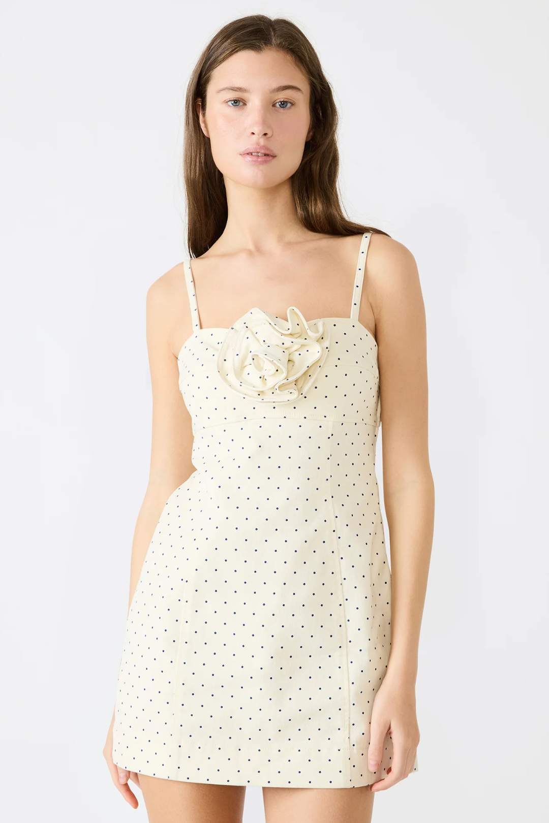 Soft glam, sweet, and totally photo-ready. This denim Peony Mini Dress is giving timeless romance with a modern twist. Designed in a creamy ivory tone with delicate dotted detail, it features a statement 3D floral accent at the bust that instantly elevates the look. The structured silhouette keeps it flattering, while the adjustable straps let you find your perfect fit. Perfect for engagement parties, birthday celebrations, bridal showers, or vacation dinners.