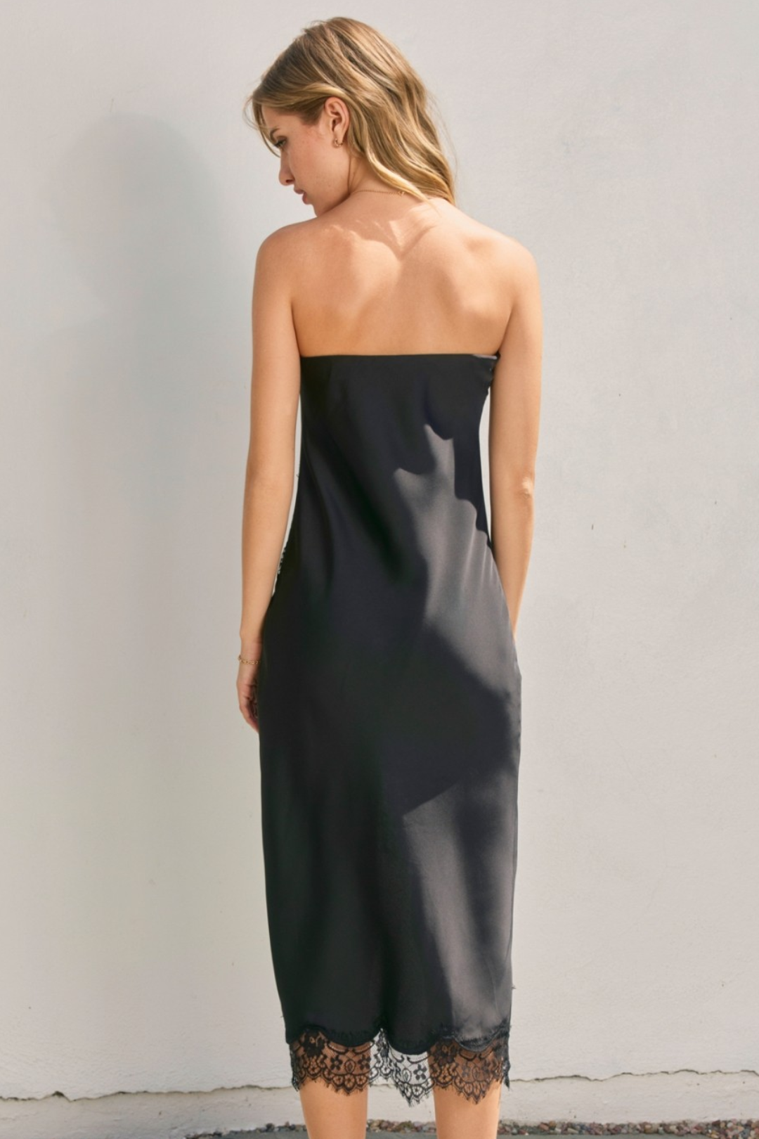 Exude timeless elegance in this alluring Lacey Midi Dress. Designed with a figure-flattering silhouette, romantic lace trim, asymmetric lace hemline, and is made from a satin fabric. Perfect for romantic evening dates, cocktail parties, black-tie weddings, or any occasion.