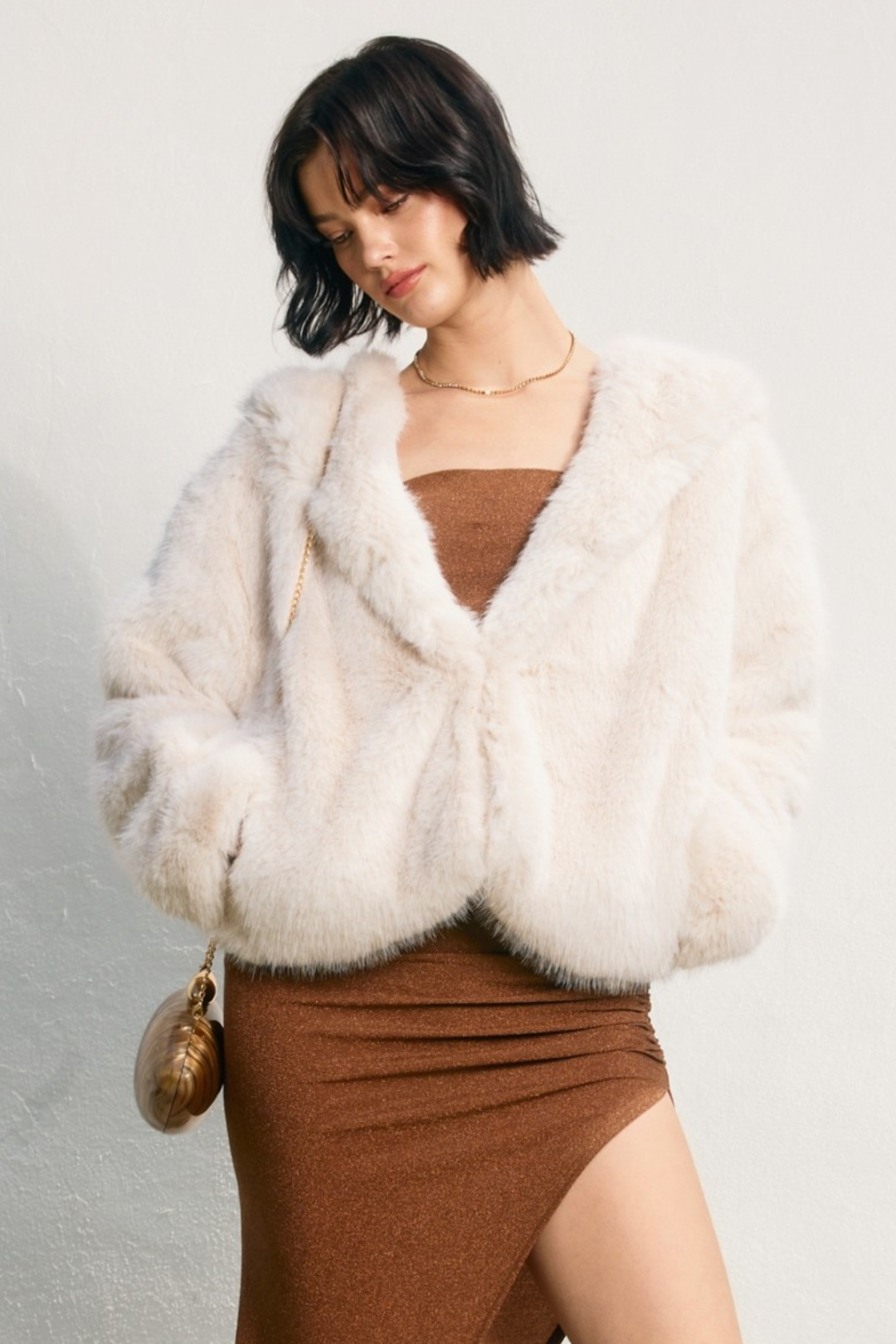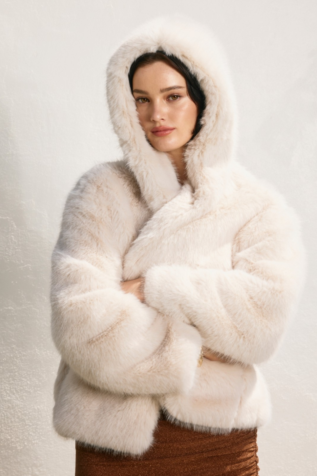 Make cold days look expensive in this Snow Girl Jacket. This ultra-soft faux fur layer brings instant glam with its plush texture and cozy hooded silhouette. The creamy neutral tone keeps it chic, while the relaxed fit makes it easy to throw on and go. Finished with front hook-and-eye closures and side pockets, it's the kind of statement piece that upgrades everything underneath. Perfect for winter brunch dates, holiday parties, girls' night, festival fits, and cool-weather photo moments.