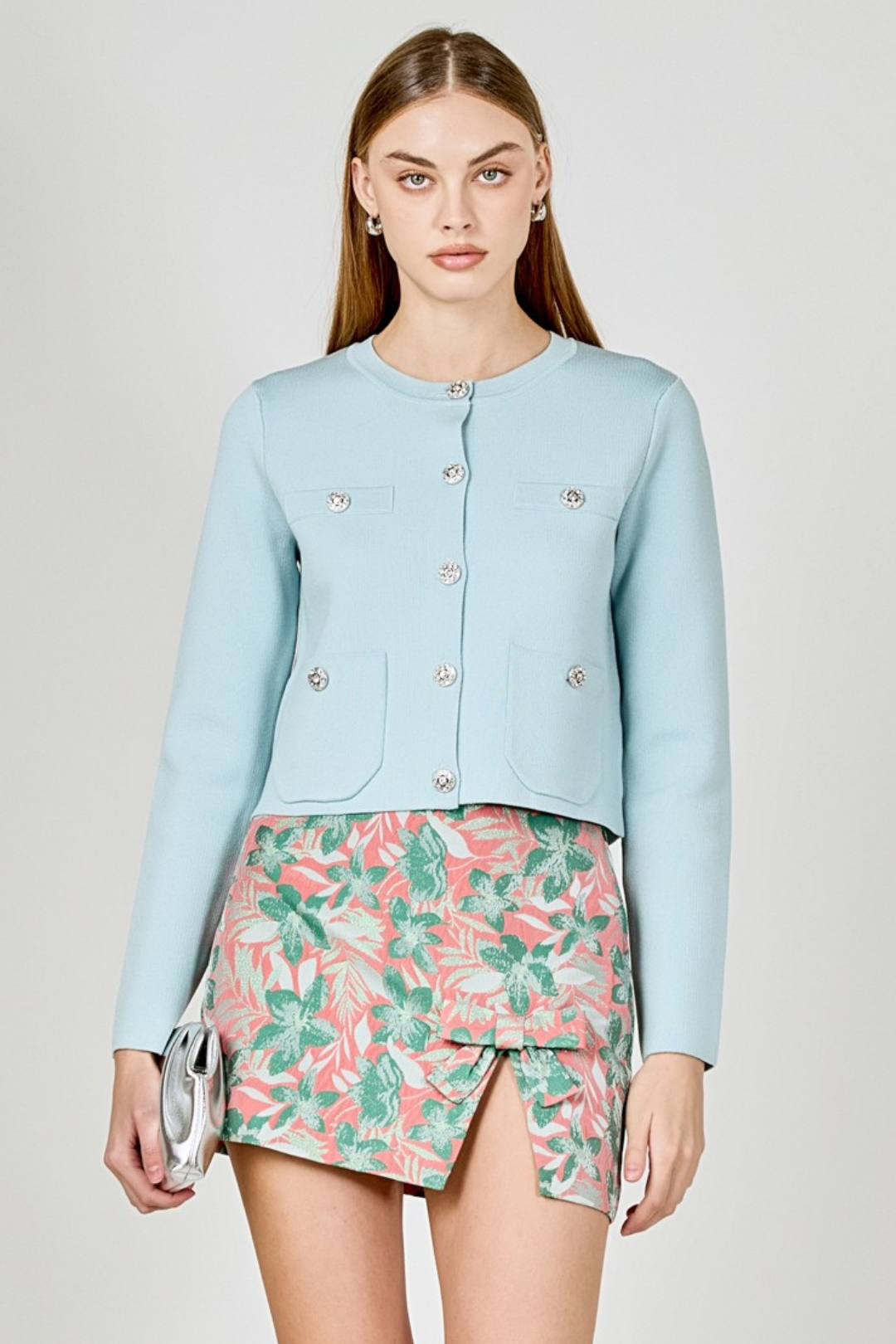 Light, feminine, and made for compliments. This floral jacquard Brocade Skirt is giving soft romance with a little edge. The textured fabric adds depth, while the mini length and front slit keep it playful and fresh. Finished with a bow detail, it's the kind of skirt that feels dressed up but is still totally wearable. Perfect for brunch dates, garden parties, daytime events, vacations, or casual nights out.
