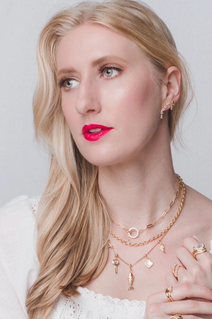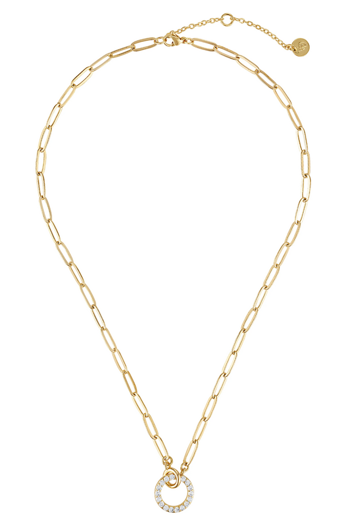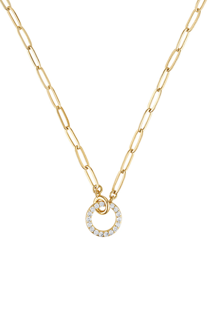 Meet the necklace that feels both bold and timeless. The Cyrus Interlocking Circle Necklace features an elongated paperclip chain with a petite smooth circle that interlocks with a big micro pave CZ circle pendant. This necklace is designed to elevate your everyday stack. Perfect for gifting moments, anniversary dates, brunch plans, or adding a little meaning to your daily lineup.
