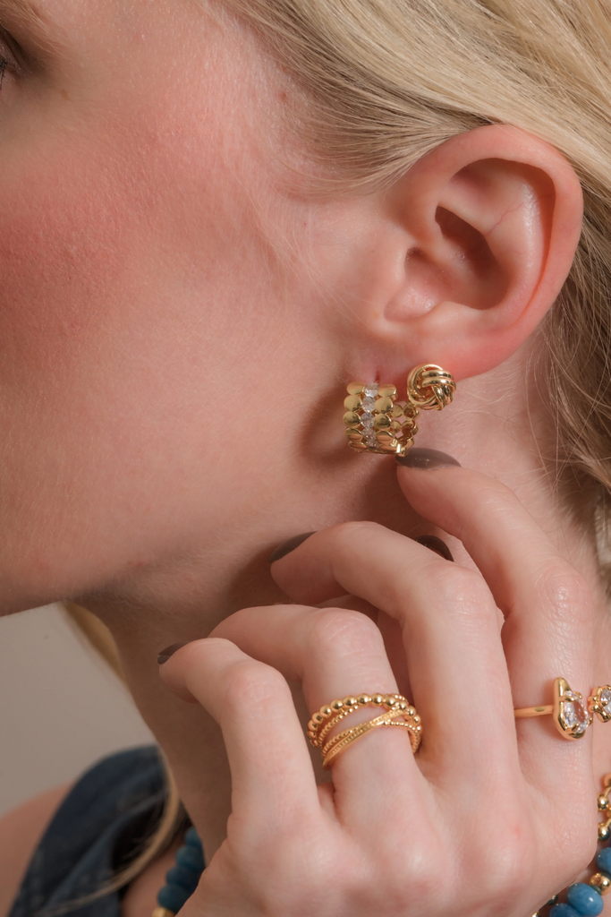 Meet the huggies you'll wear on repeat. The Ellis Huggies Earrings bring a fresh twist to a classic mini hoop, designed with rows of rounded gold links and a sparkle line of CZ stones through the center. Chic, shiny, and super wearable—they're the tiny statement your ear stack has been waiting for. Perfect for everyday shine, office-to-dinner looks, brunch dates, and gifting your jewelry-obsessed bestie.