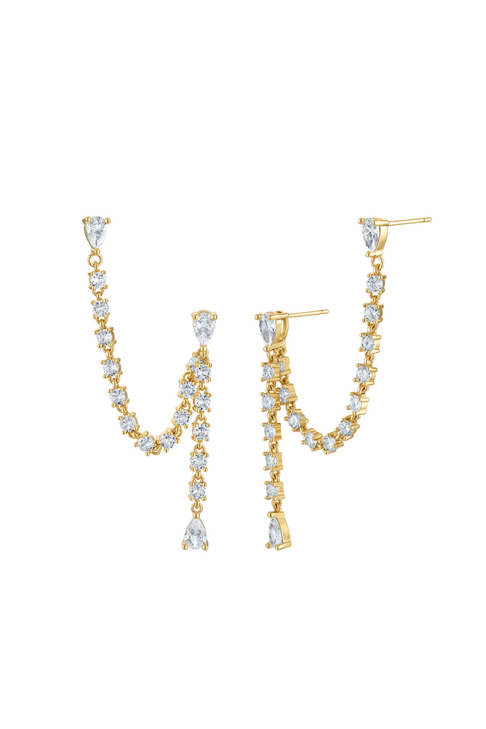These Hollis Double Earrings give main-character sparkle everywhere you go. It brings a dramatic drop with dual CZ strands that curve and shimmer with every move. Each strand ends in a pear-cut stone, catching the light like you're walking your own spotlight. Perfect for dressy nights out, weddings, cocktail events, holiday parties, or anytime you want to glam up a simple outfit with statement shine.