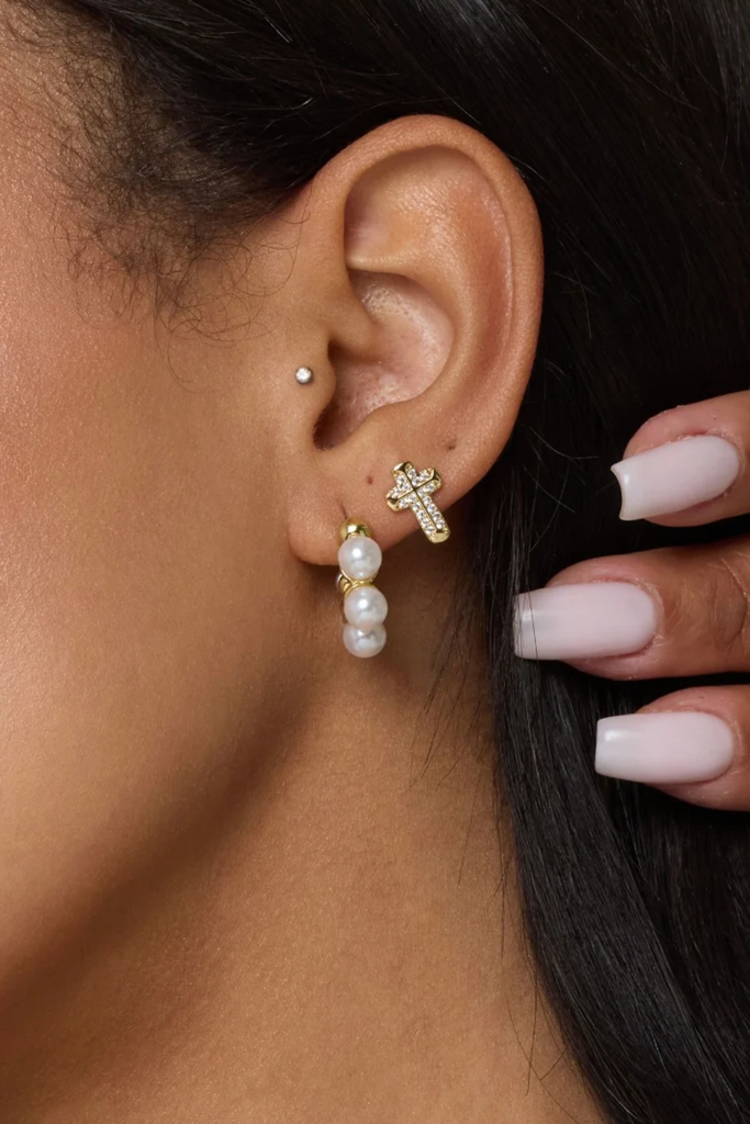 Soft, sweet, and totally glow-giving—these mini Kona Pearl Hoops are your new effortlessly cute essential. With a row of radiant freshwater pearls along a sculpted gold vine, they bring a soft shimmer that works from brunch dates to dressed-up nights. Pair them with layered dainty necklaces for a chic, clean-girl vibe, or wear them solo to let the pearls shine center stage.