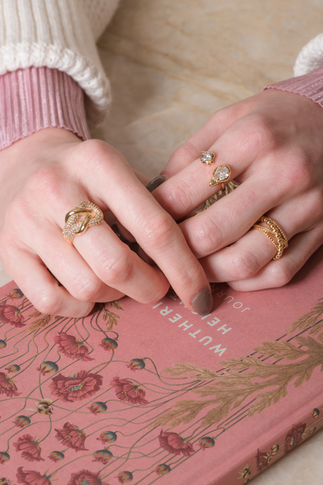 Make your everyday shine a little brighter with the Lorelai Wrap Ring. This dreamy wrap design shows off two sparkling cubic zirconia stones that sit beautifully on an open gold band, giving that effortless luxe vibe. One side features a clean round cut for classic sparkle, while the other glows with a pear-shaped stone. Wear it solo for a chic, sculptural statement, or stack it with thin gold bands for a layered, celestial vibe. It pairs flawlessly with dainty bracelets and soft neutral nails.