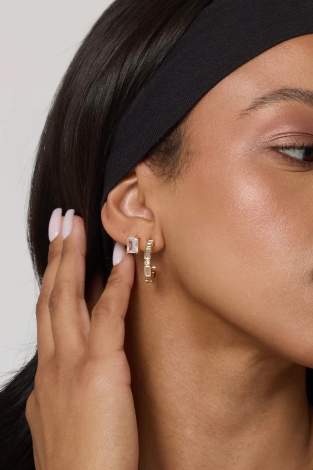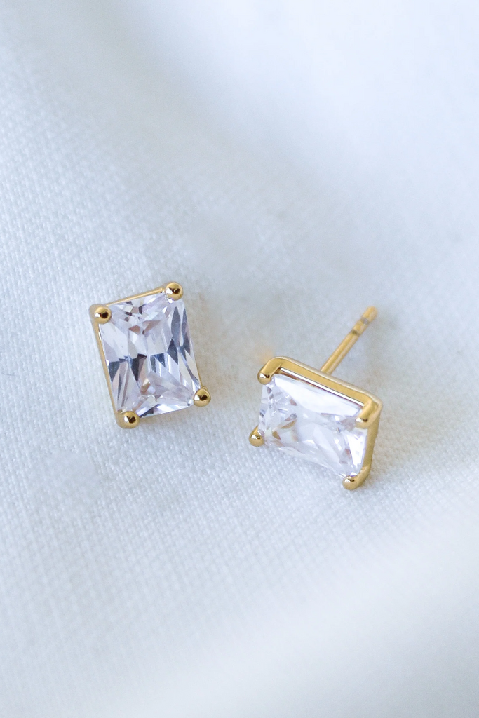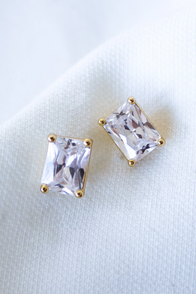Meet your new everyday flex: the Prism Studs, where clean lines meet major sparkle. These radiant rectangle-cut studs give off that crisp, glassy shine that instantly elevates any look—simple, chic, and low-key iconic. Pair with mini hoops for a stacked ear vibe, add to your gold layers for soft glam, or wear solo when you want minimal sparkle with max effect.