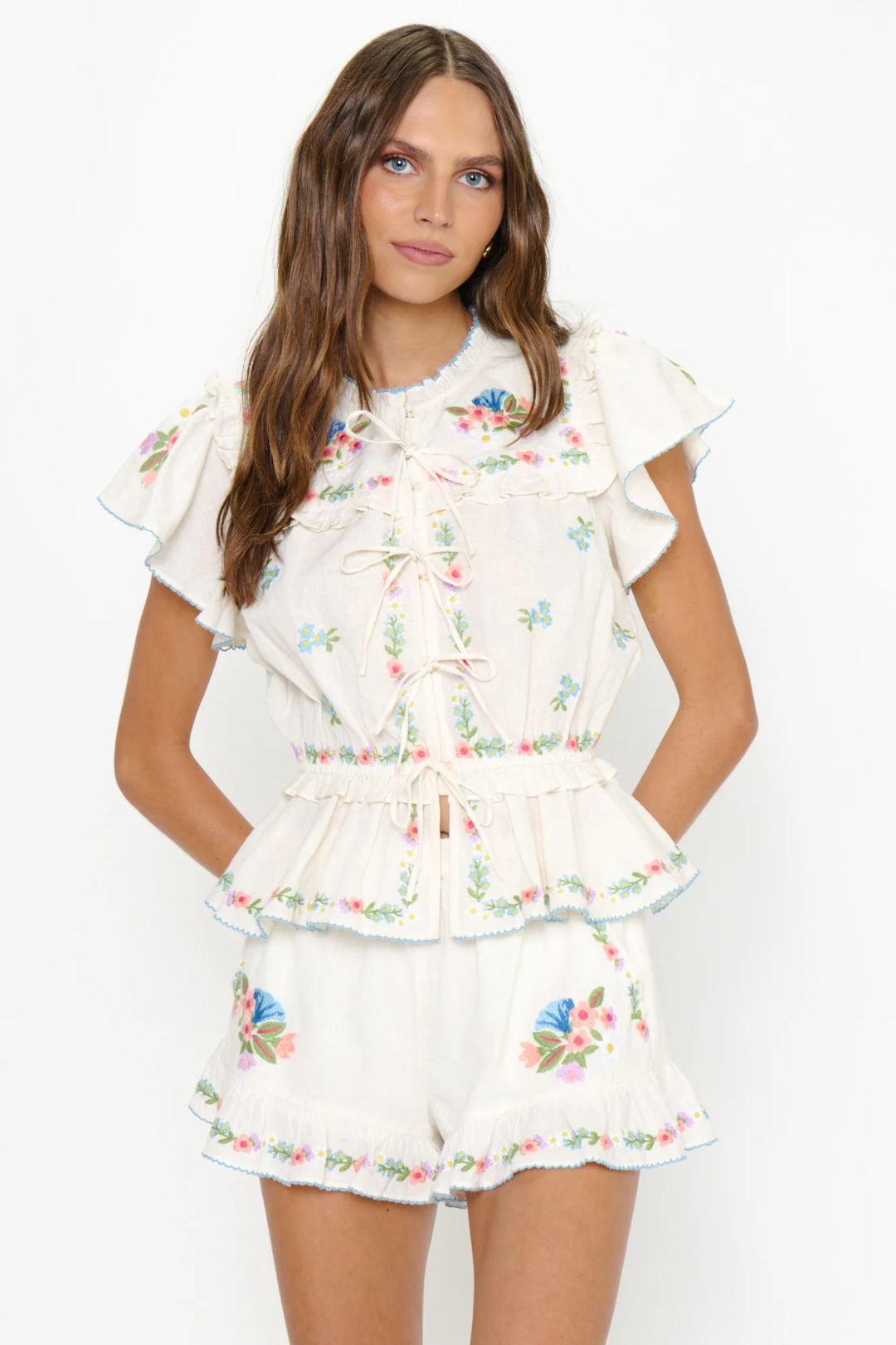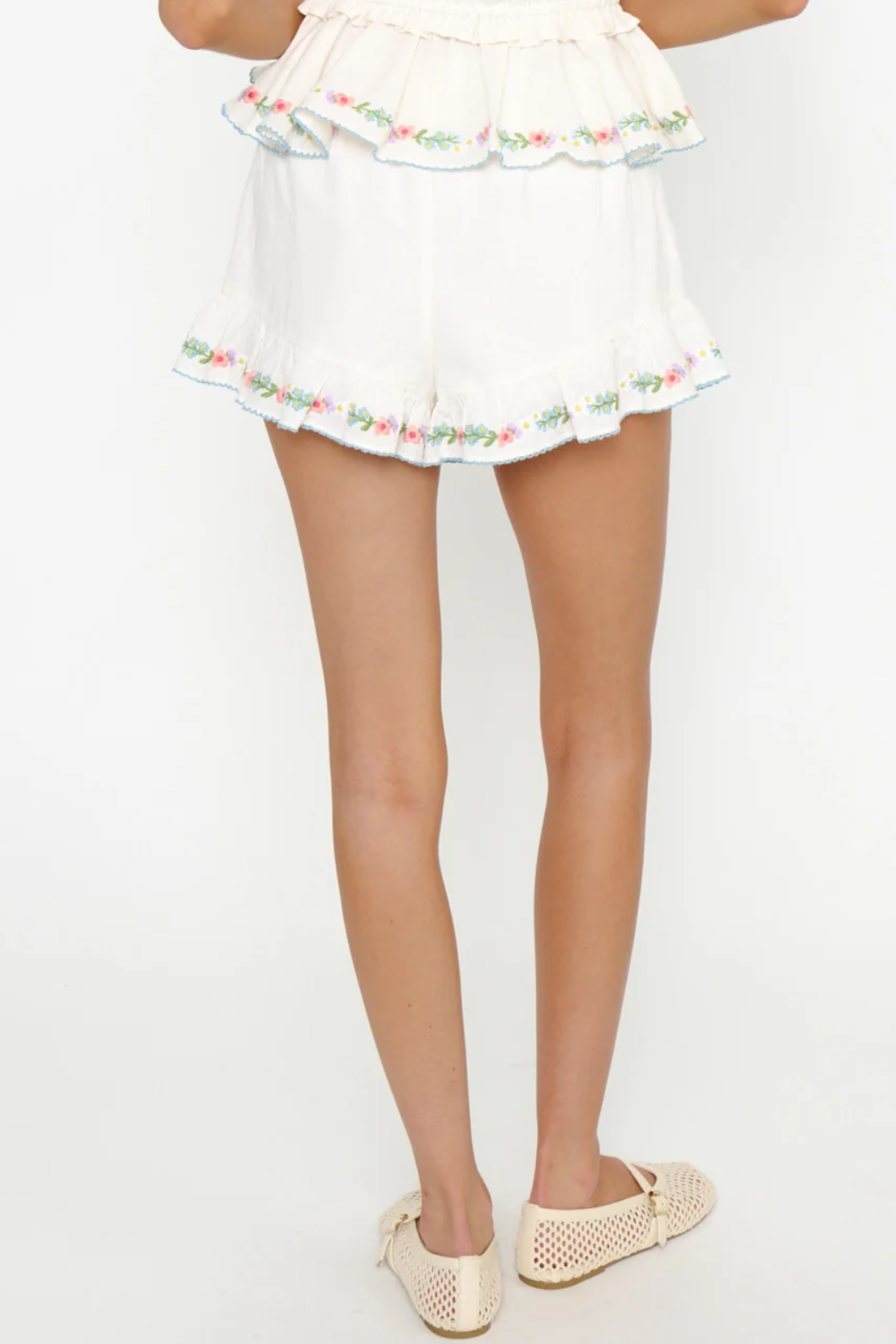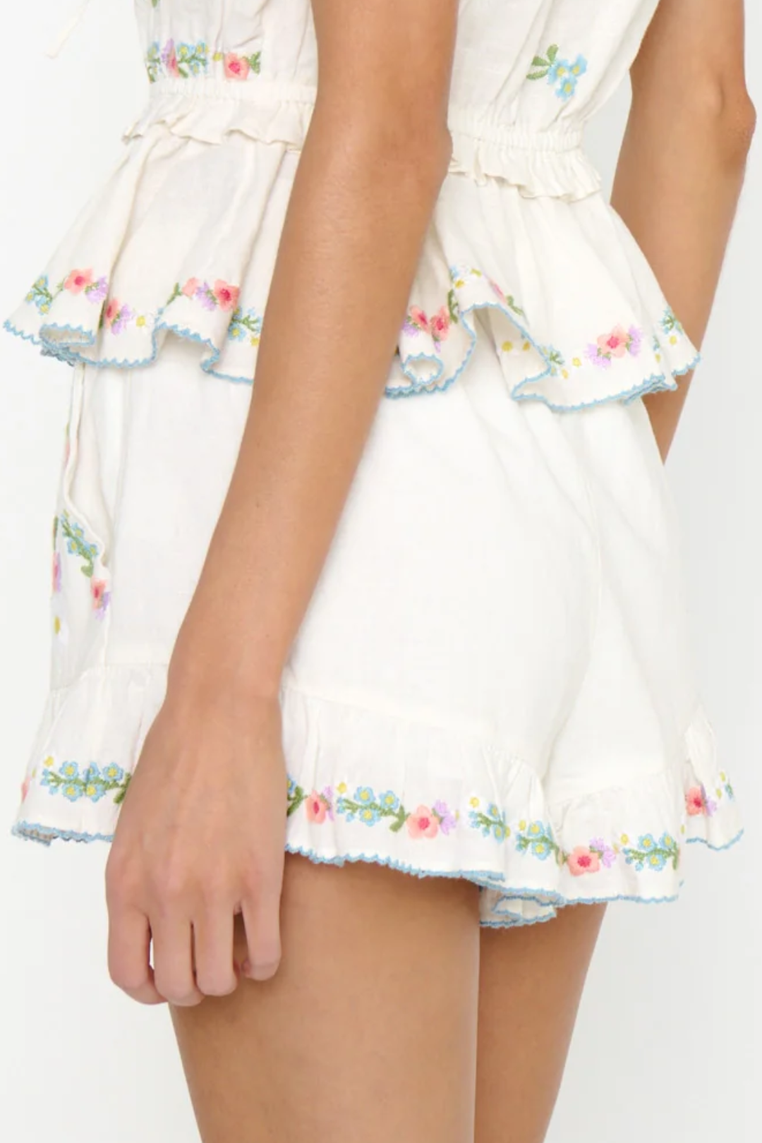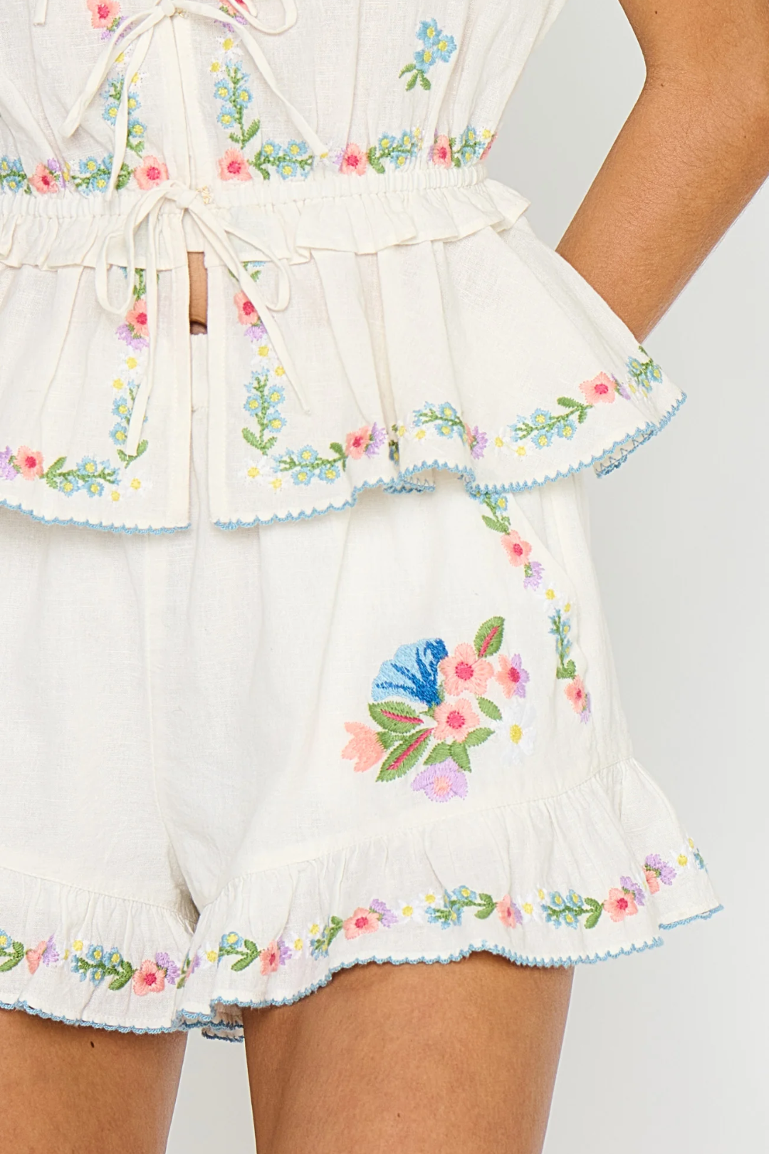 The Cannes Shorts bring soft romance to your warm-weather wardrobe. Designed with delicate floral embroidery and a breezy cotton-linen blend, they feel light while still looking elevated. The elastic waistband keeps them comfy and easy to wear, while the subtle ruffle hem adds that playful, feminine finish. They're the kind of shorts that instantly make an outfit feel styled. Perfect for spring brunches, vacation strolls, outdoor parties, weekend markets, and sunny getaway looks.