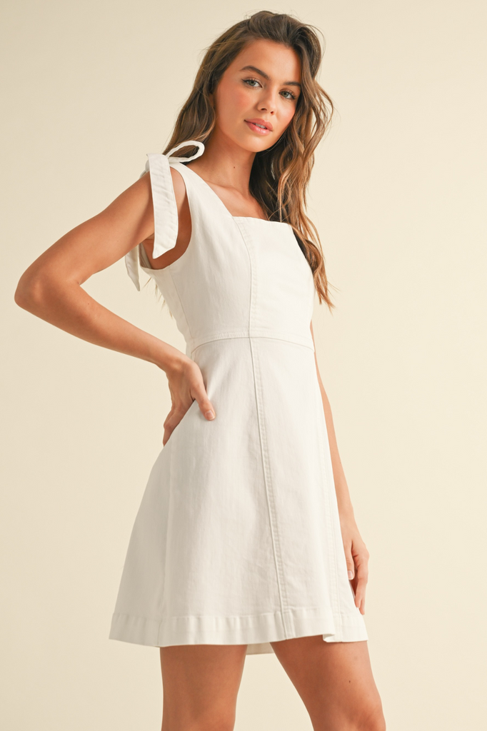 Sweet meets structured in this pretty Denim Bow Dress. It's a mini-length dress with a cotton tie on the sleeves, a square neckline, and a back zipper closure. Perfect for sunny days, weekend brunches, bridal events, or date nights.