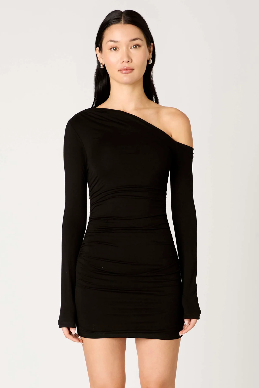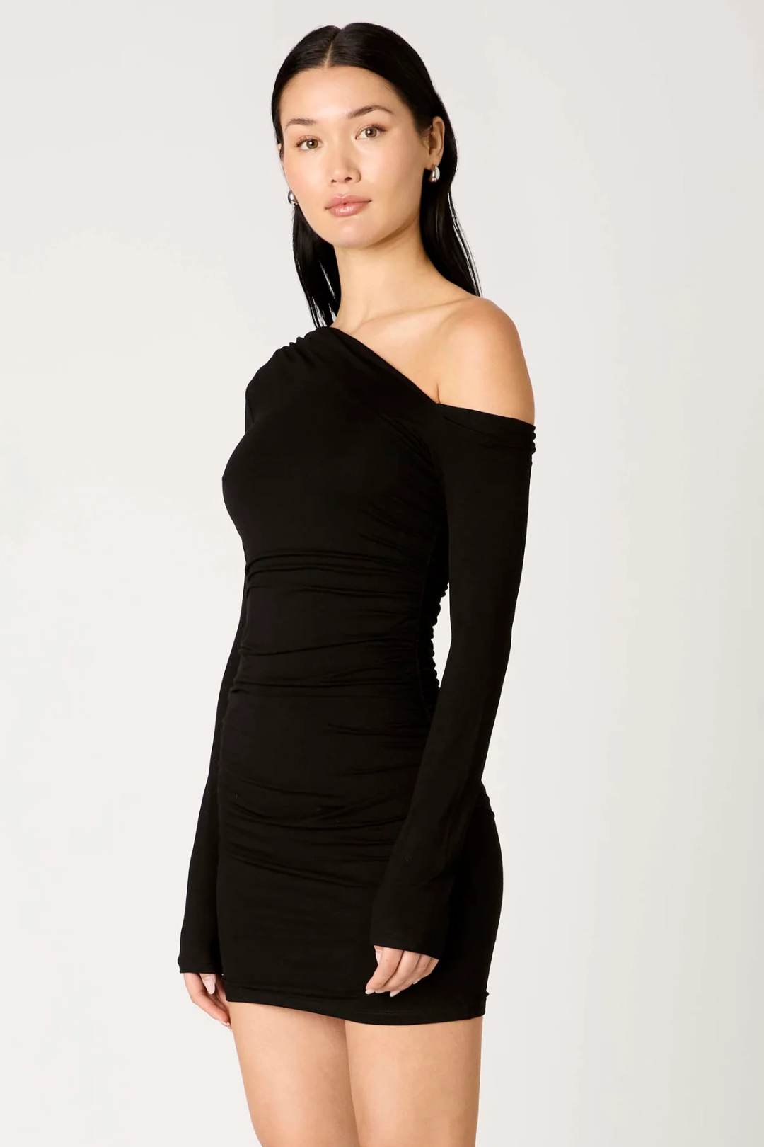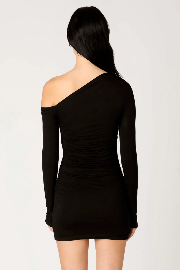 Step out unapologetically hot in this Arwen Dress from NIA. It hugs your body in all the right places with a sleek one-shoulder cut that instantly turns heads. Designed with a single long sleeve and allover ruching through the side and back for a flawless fit. Perfect for girls' nights out, date nights, cocktail parties, and birthday looks.