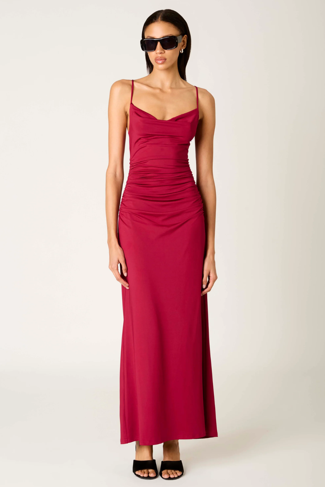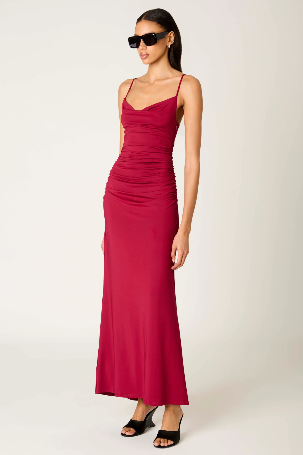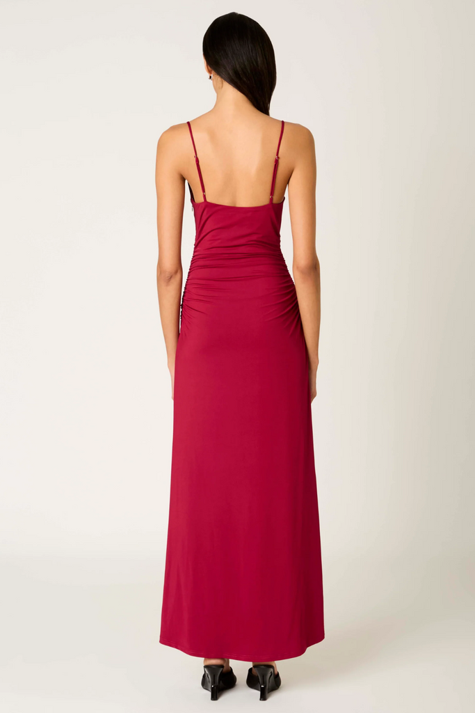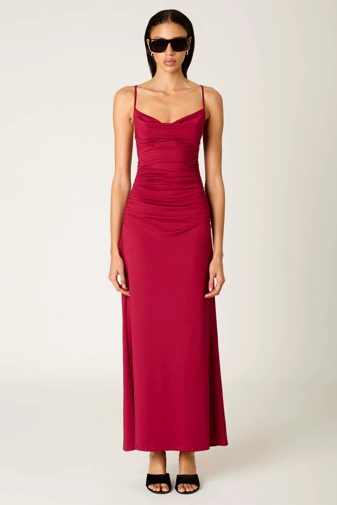 The Ina Dress serves full romance with its cranberry hue and figure-hugging drape. Soft ruching flatters from every angle, while the cowl neckline and adjustable straps give it that sultry, effortless fall. Perfect for holiday parties, winter date nights, weddings, or any occasion where you want to glow without trying too hard.