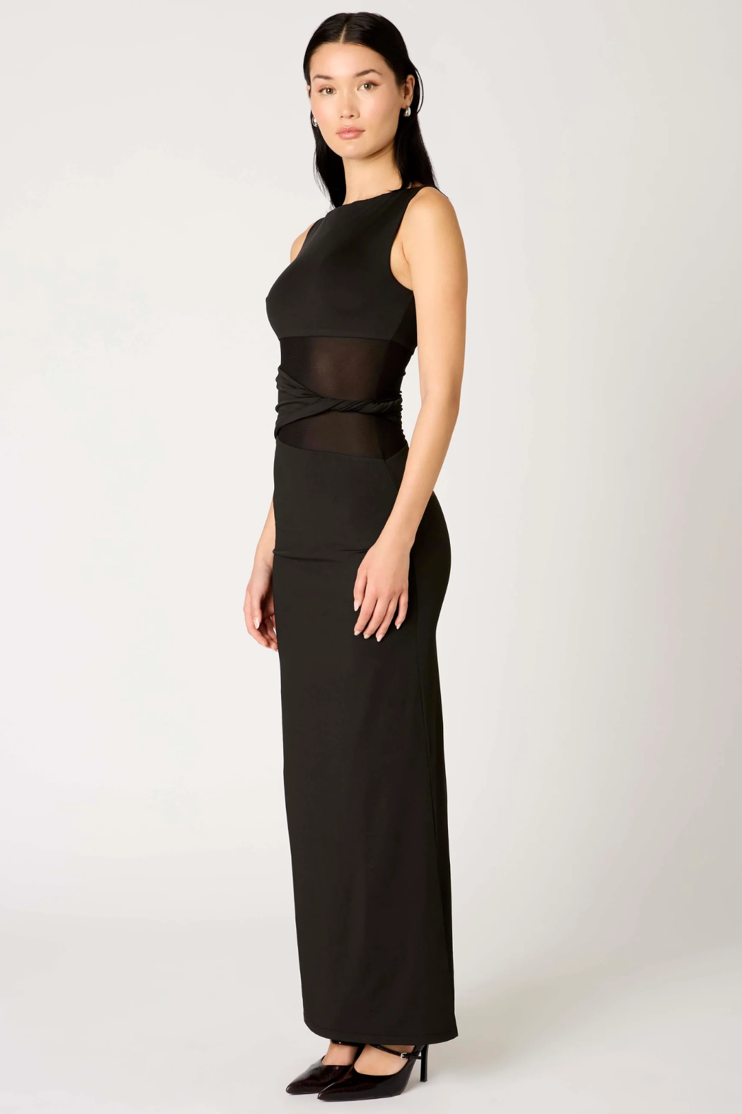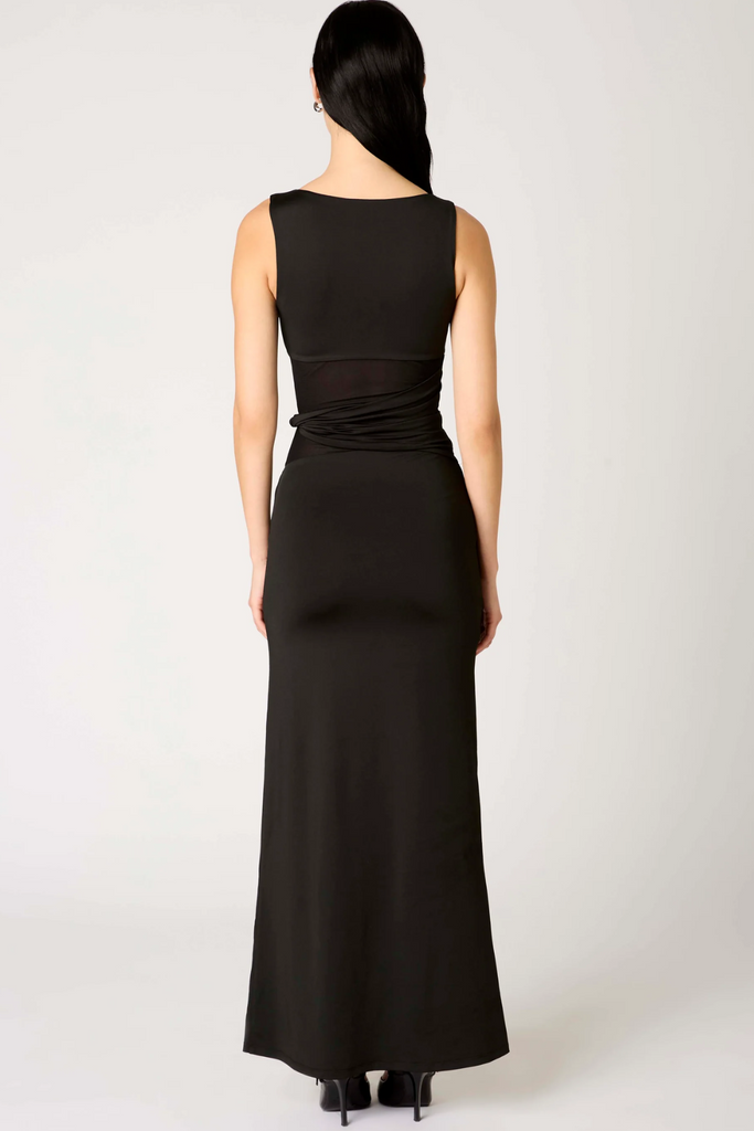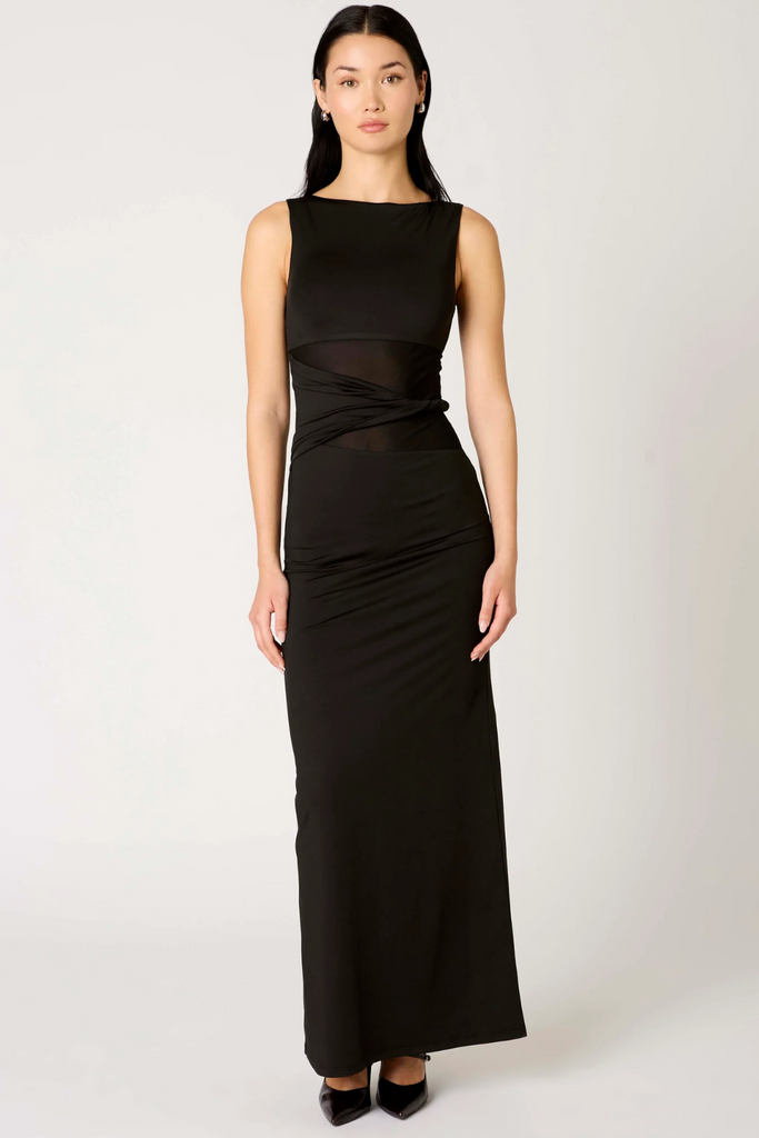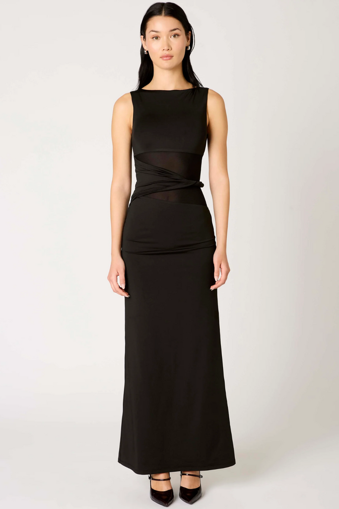 Make a statement in this alluring and elegant Ione Dress from NIA. Designed with a high halter neckline, a sheer mesh midriff for a hint of contrast, and a twist waistband detail that accentuates the waist before flowing into a maxi-length finish. Perfect for candlelit dinners, evening events, or any moment when you want to turn heads.