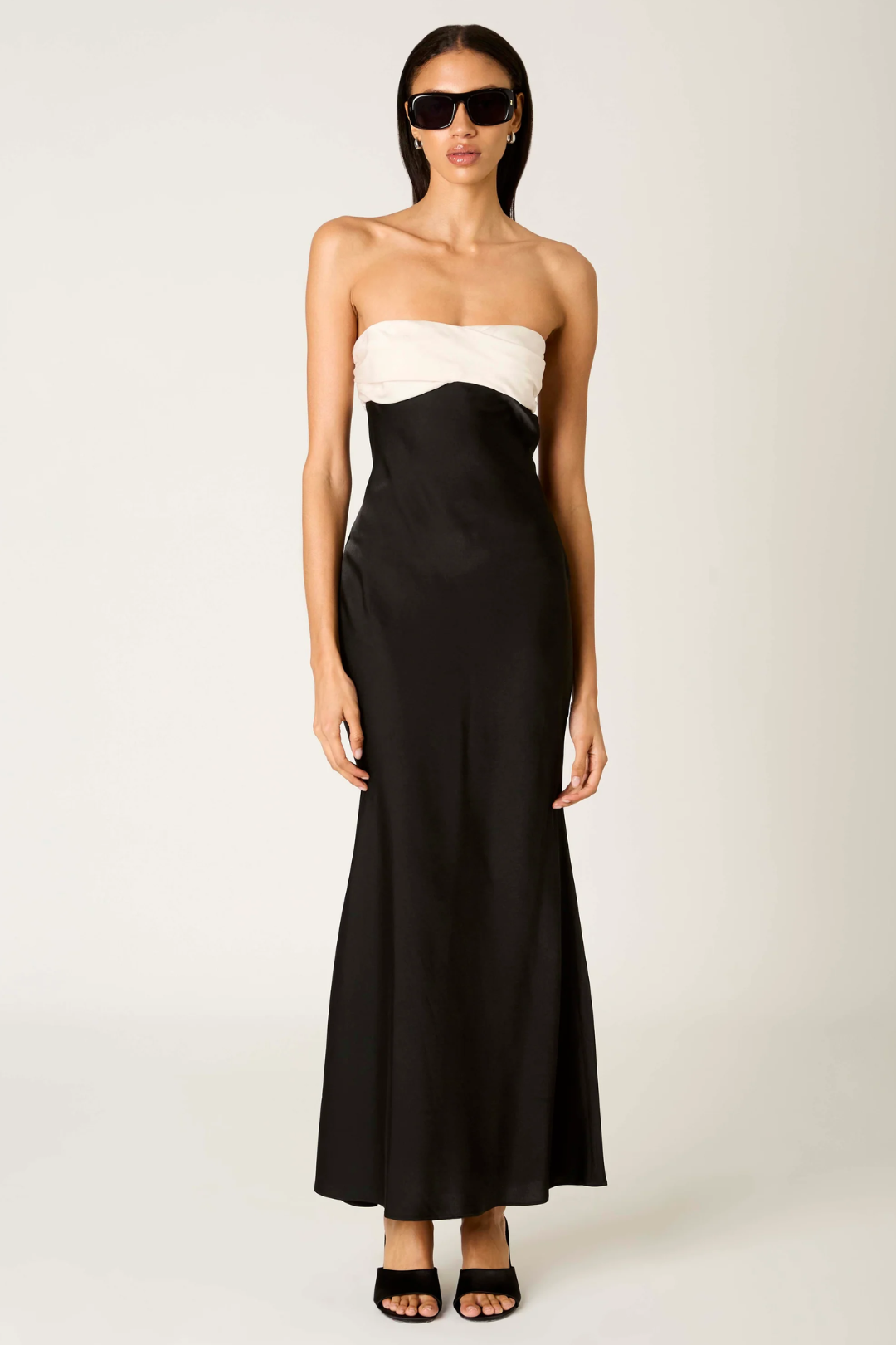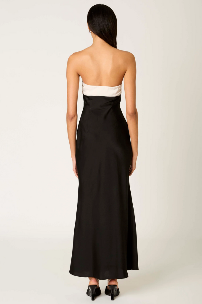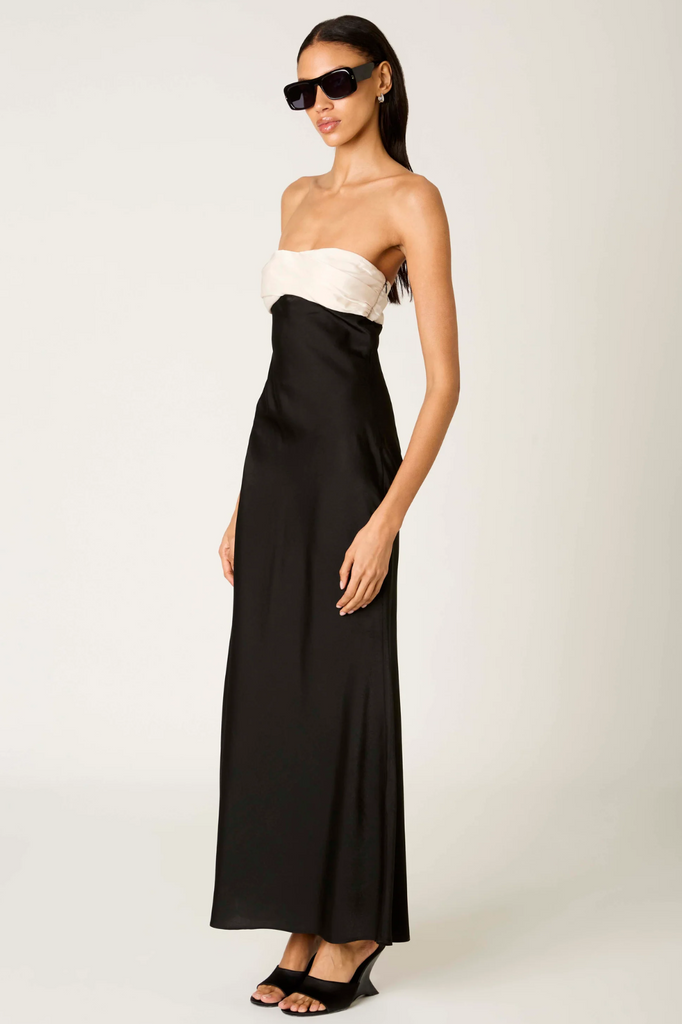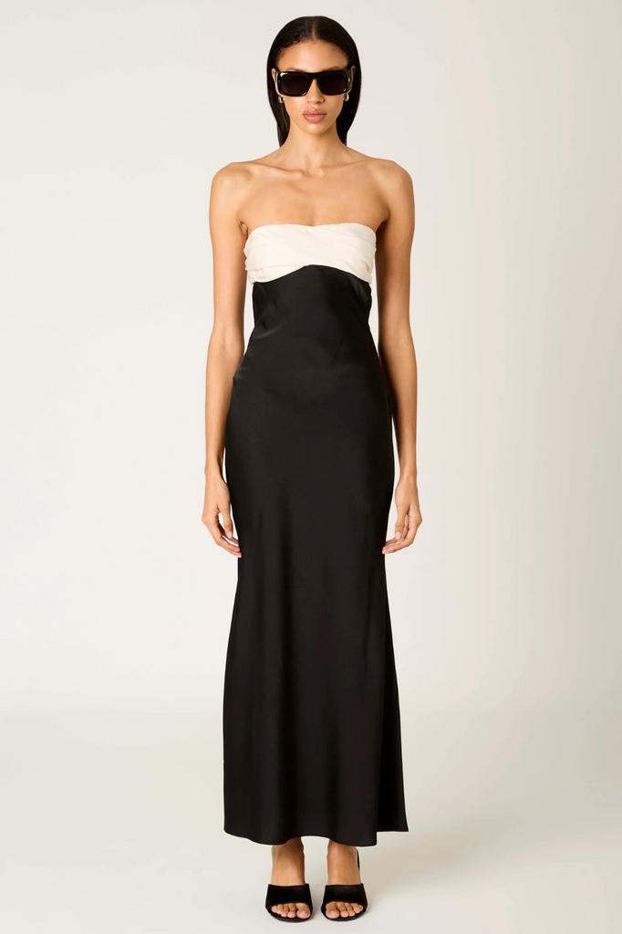 The Sunset Dress brings effortless elegance with a modern, sculpted twist. Designed with a straight strapless neckline and a soft ivory draped overlay across the bust, it creates a clean, romantic contrast against the sleek black column silhouette. The fit is smooth and structured through the bust, waist, and hips, flowing into a gentle maxi-length flare. Perfect for evening weddings, romantic dinners, formal parties, or any moment you want to look timeless with a hint of drama.