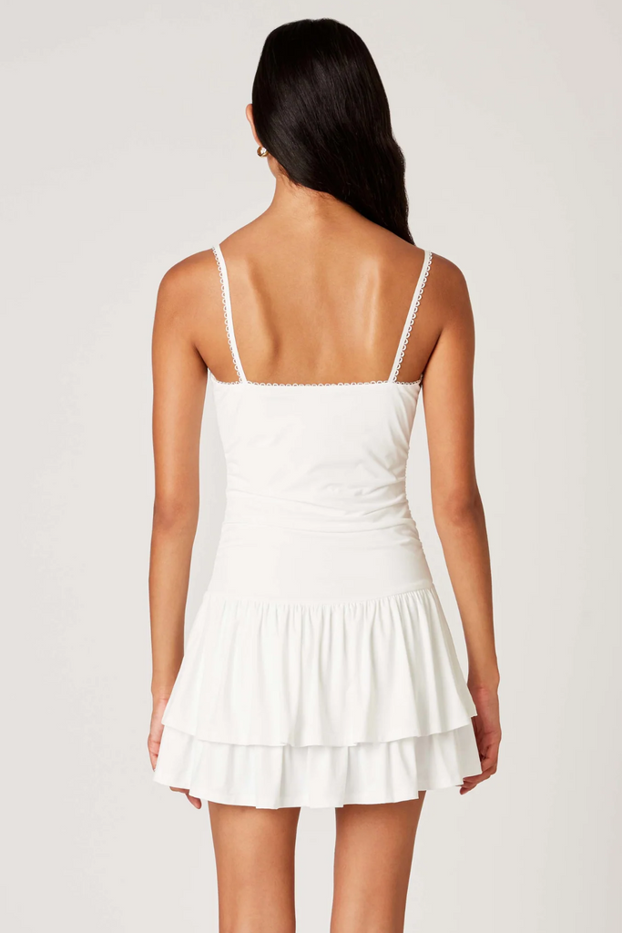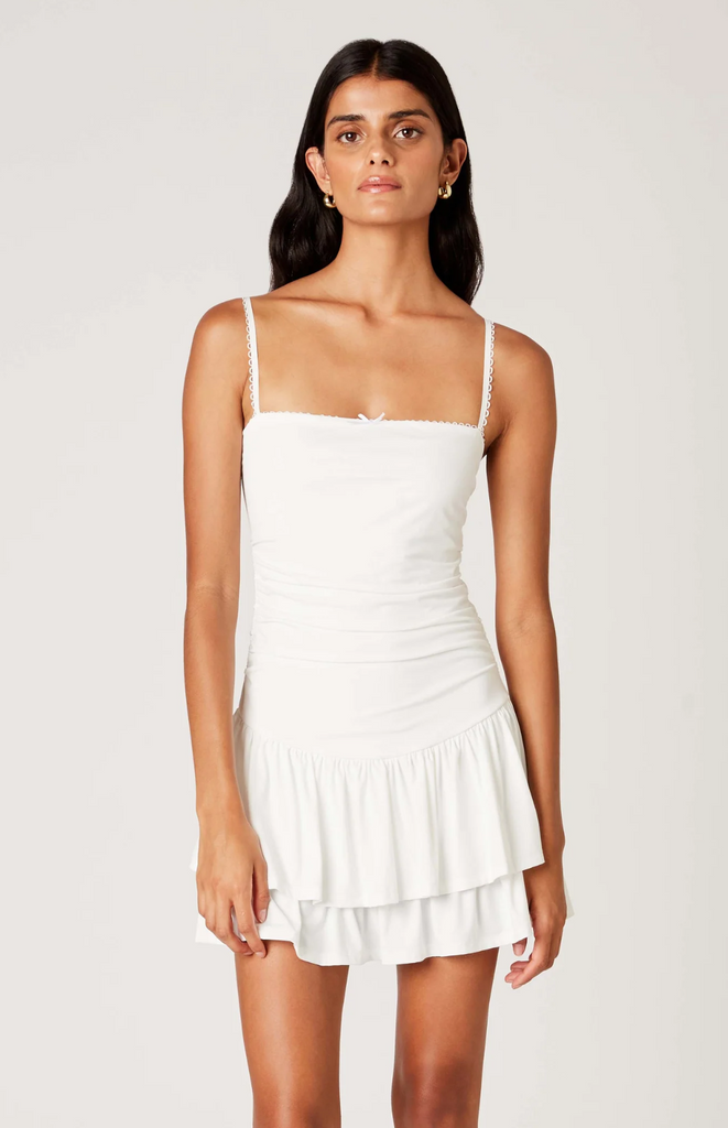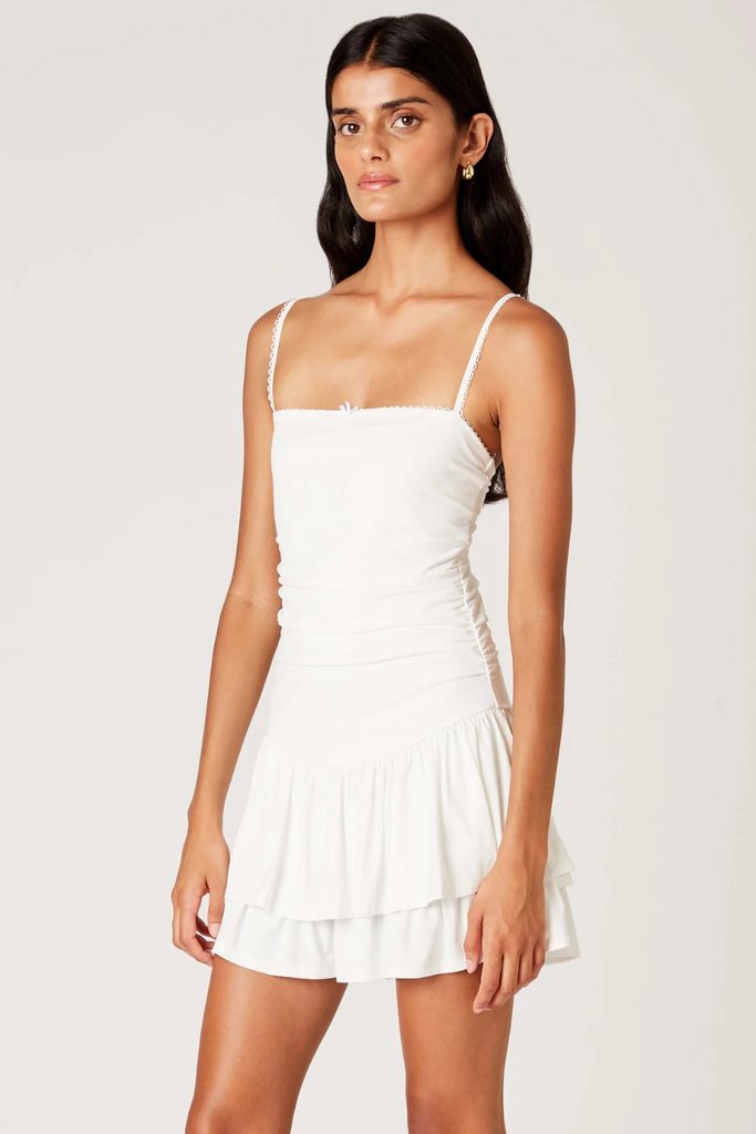 Dance the night away in this playful and charming Toto Dress by NIA. It's a body-hugging fit dress with a bow detail, spaghetti straps with lace trim, double-tiered ruffle skirt, and a subtle ruching through the bodice. Perfect for cocktail parties, birthday events, or date nights.
