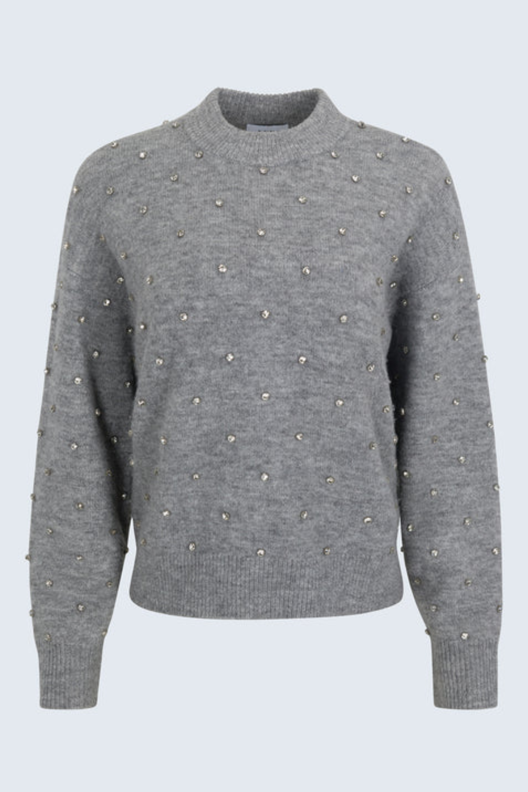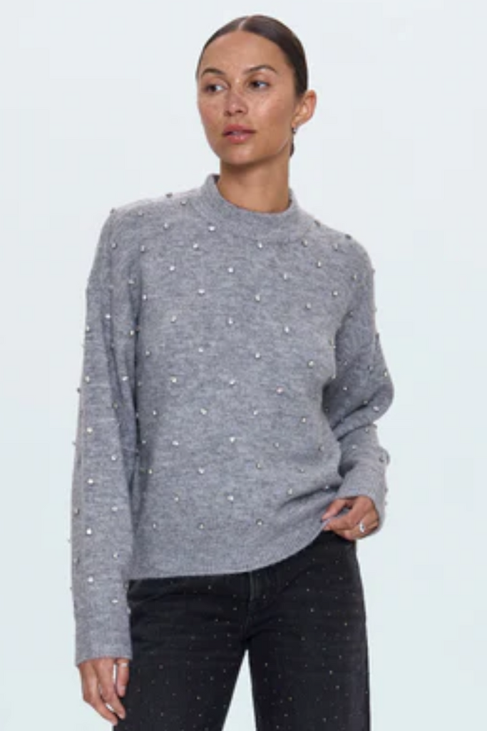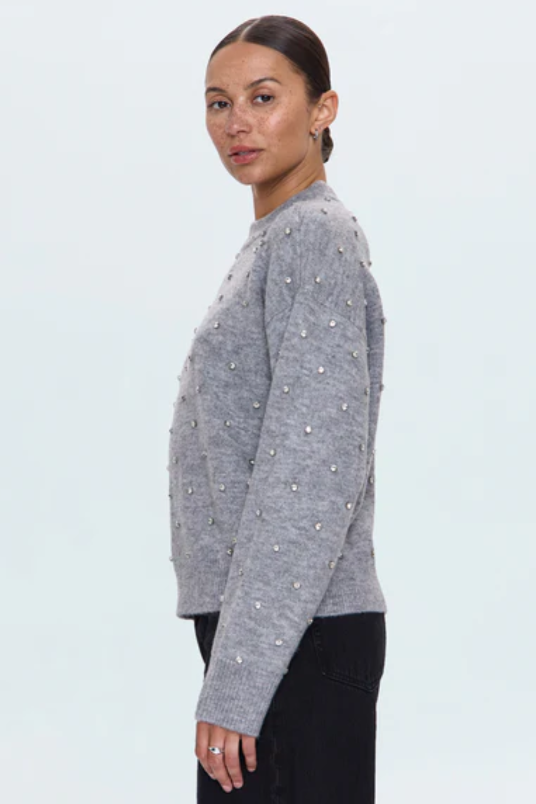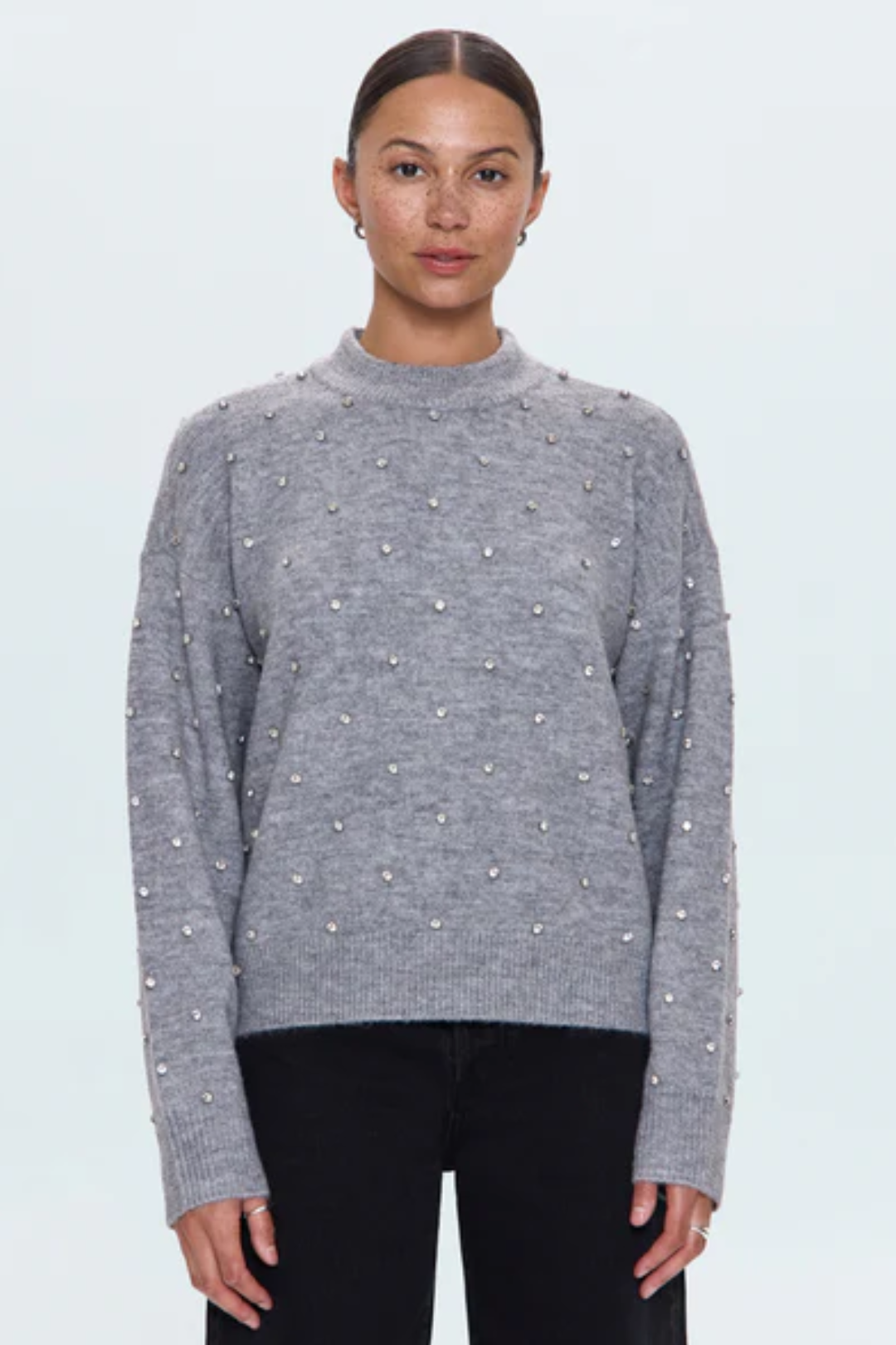Cozy with a sparkle twist. This relaxed-fit charcoal sweater is sprinkled with delicate crystal embellishments that add just the right touch of shine. Soft, warm, and easy to throw on, it drapes effortlessly for that comfy-but-polished vibe. The gray hue keeps it classic, while the diamante details make it feel a little extra in the best way. Perfect for workdays, winter brunch, holiday hangs, or anytime you want a cozy layer with a hint of glam.