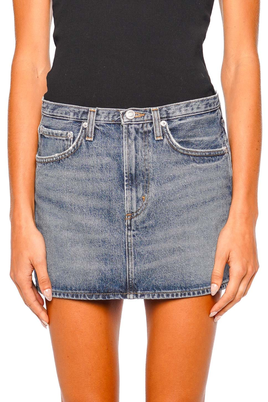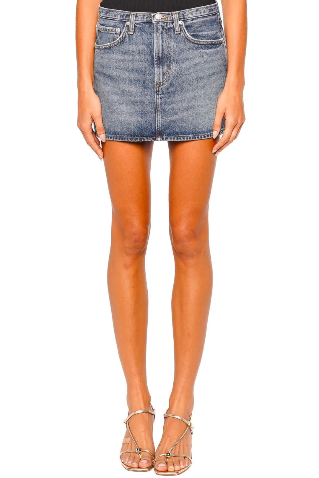 Own the moment in this denim Keira Skirt in Broadcast that gives classic cool with a clean, modern edge. This medium vintage indigo mini is that effortless staple you'll keep reaching for. Designed with five-pocket styling and made with rigid, non-stretch cotton denim. The mini length keeps it fresh and versatile, whether you're dressing it up or keeping it casual. Perfect for coffee runs, casual date nights, weekend city strolls, concerts, and everyday cool-girl fits.