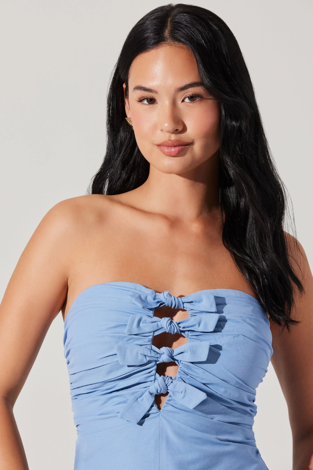 Feminine yet bold, this Kierra Top will turn heads anywhere you go. Featuring delicate ruching along the bust, a series of stacked bow details that creates soft keyhole slits between each bow for a flirty effect, no-slip grip tape along the inner top hem, and an exposed back zipper. This piece is your next go-to for nights out or statement layering.