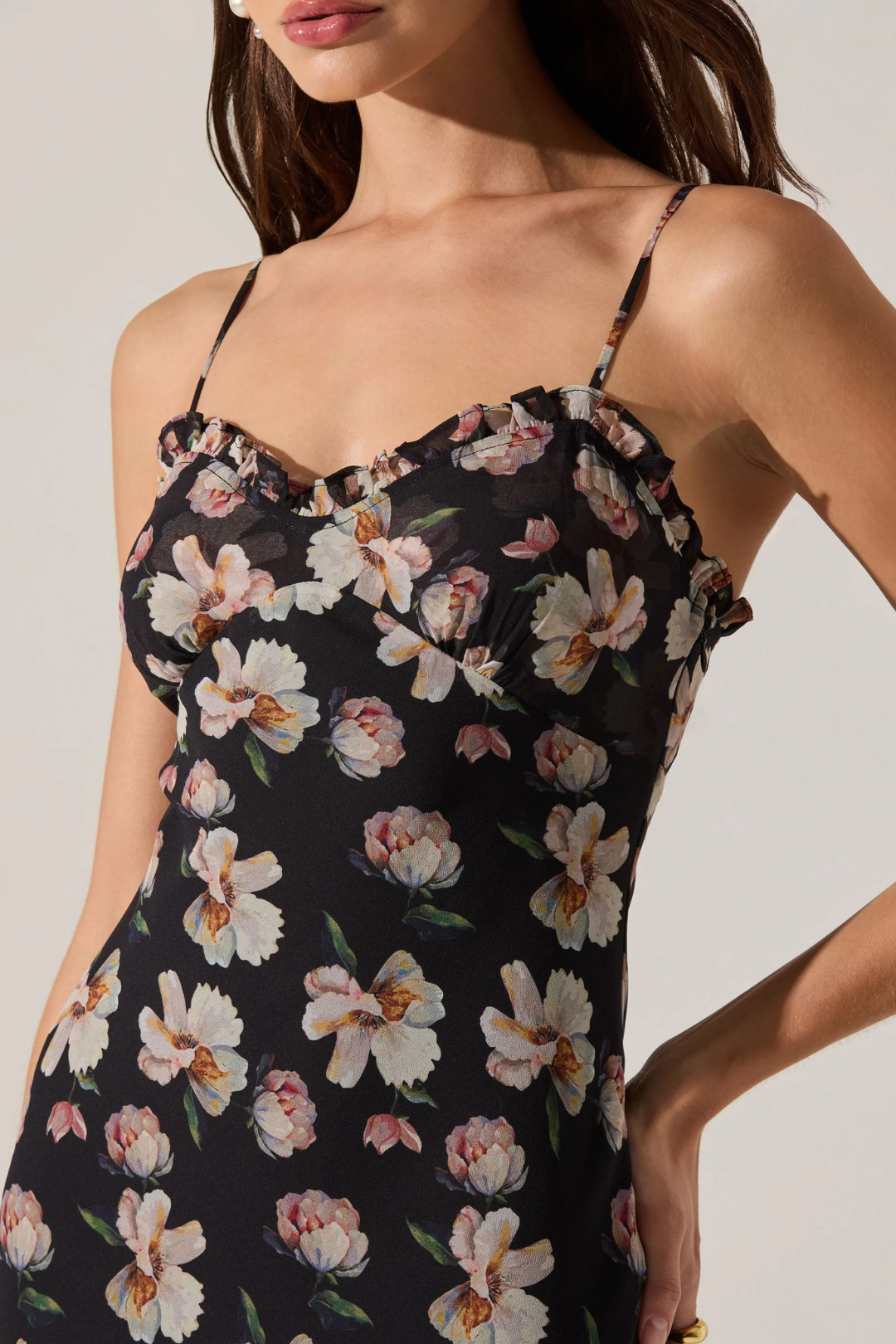 - Ruffle trim along neckline