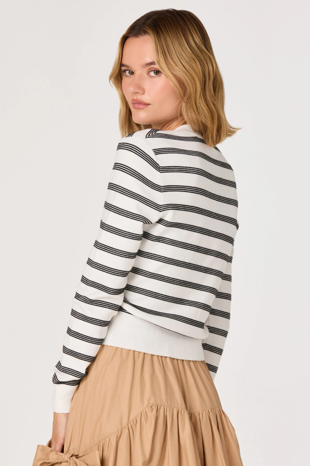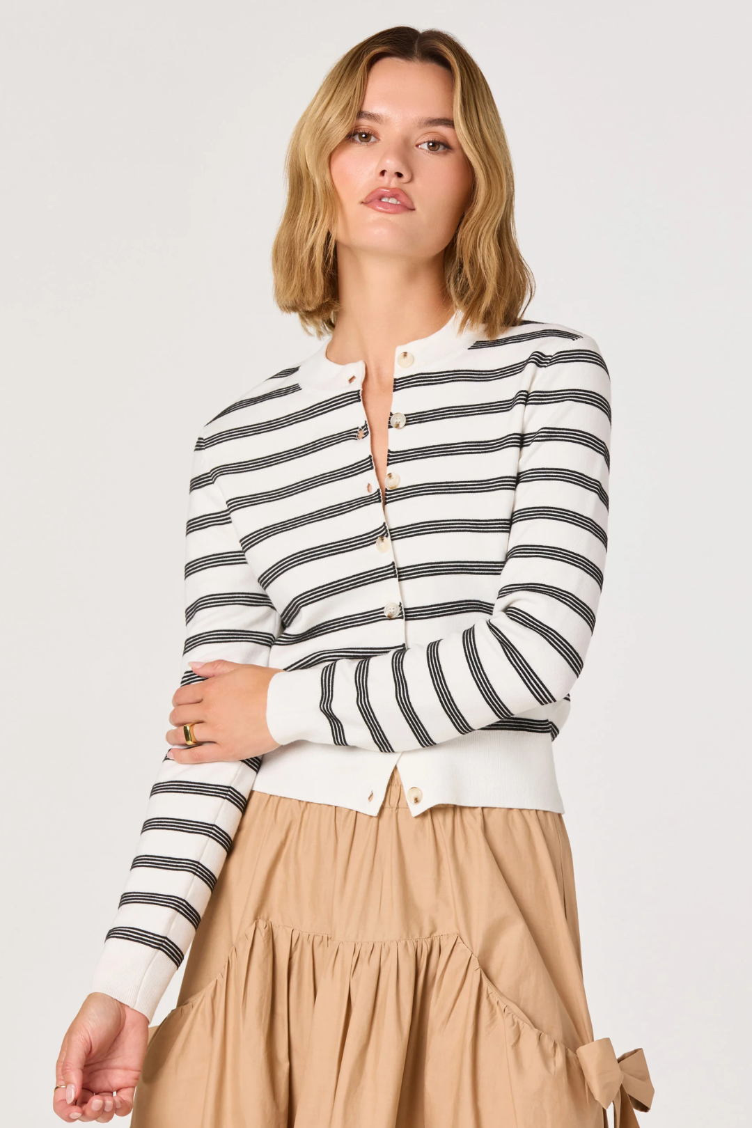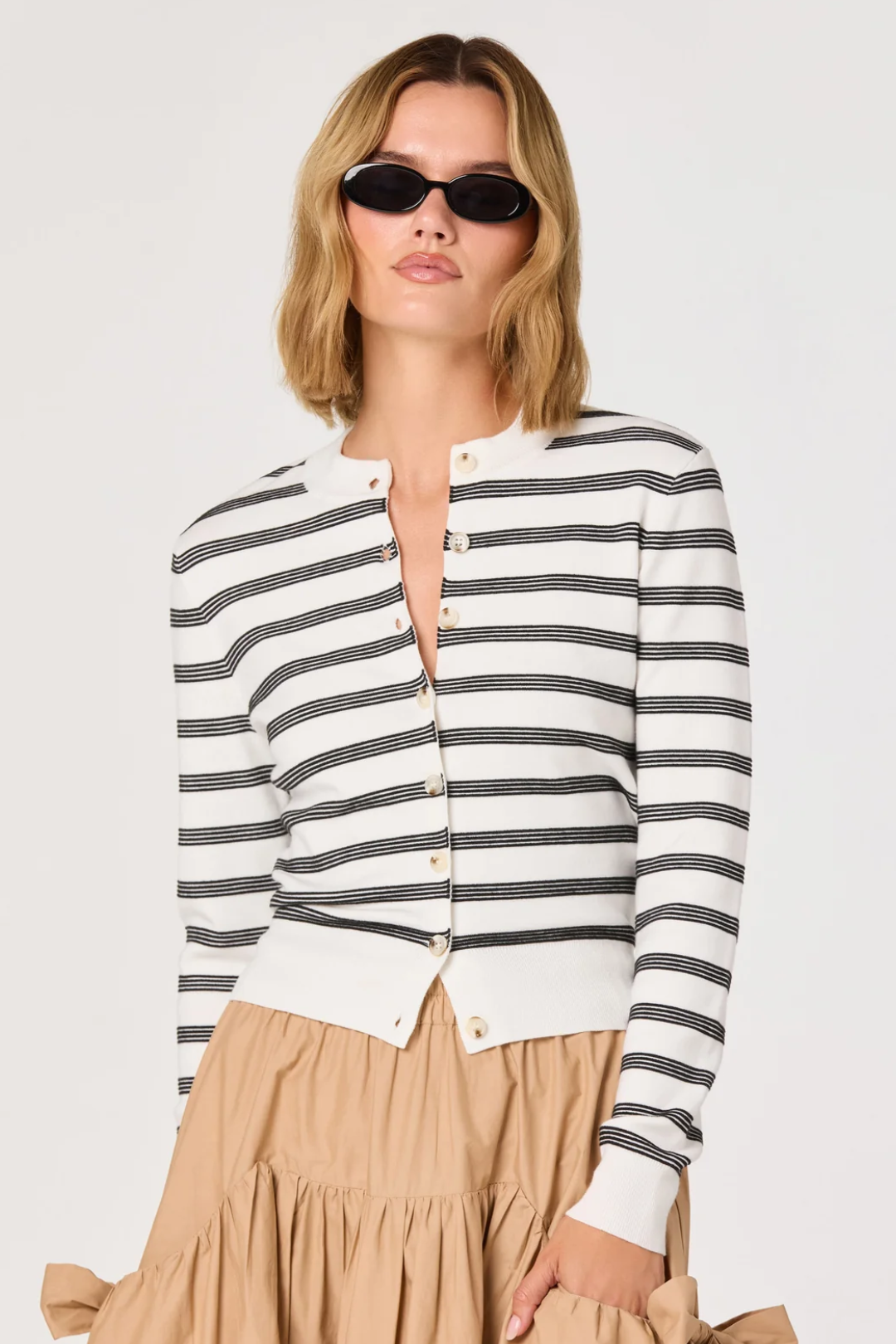 Timeless stripes, effortlessly chic. This Tawni Striped Button-Front Cardigan is one of those throw-on pieces that instantly pulls a look together. The clean black-and-white stripes keep it classic, while the button-front design gives you endless styling options. Perfect for transitional weather, office days, coffee dates, weekend errands, travel looks, or layering year-round.