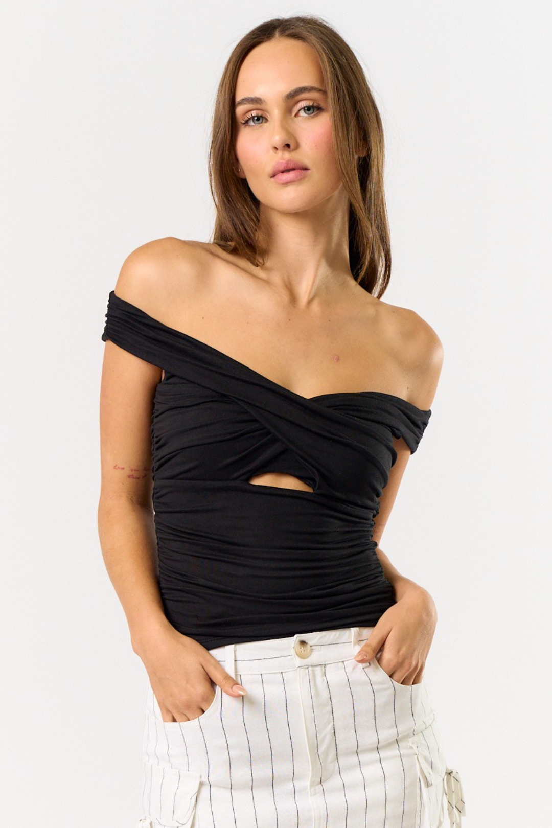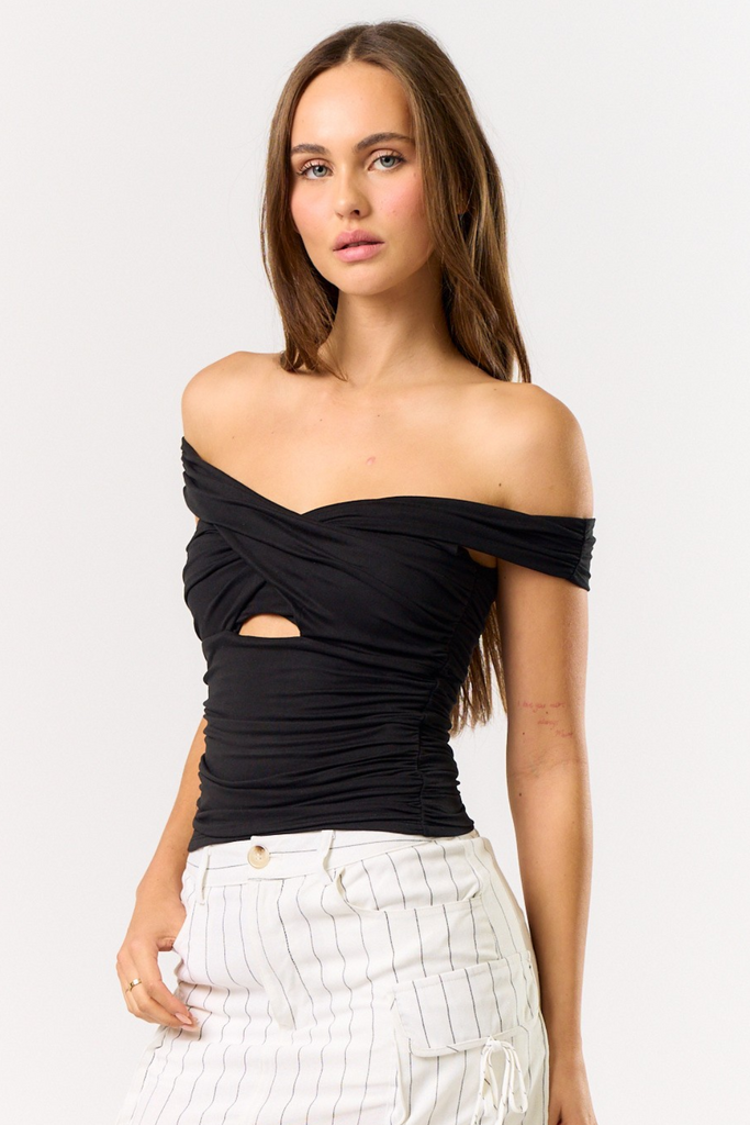 Get ready to turn heads wherever you go by wearing this Cross Front Top! It's a ruched design top with an off-shoulder neckline, a front cutout, and a ruched design. Make this your new go-to top for every girls' night out!