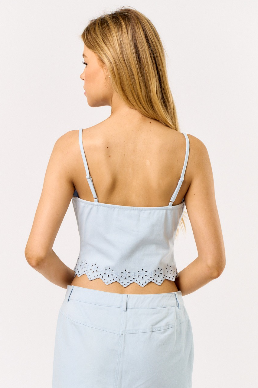 The Eyelet Denim Top is a charming addition to any denim lover's wardrobe. It's an embroidered cropped top with adjustable spaghetti straps and a scoop neckline. Perfect for a last-minute brunch or getaway during spring break.