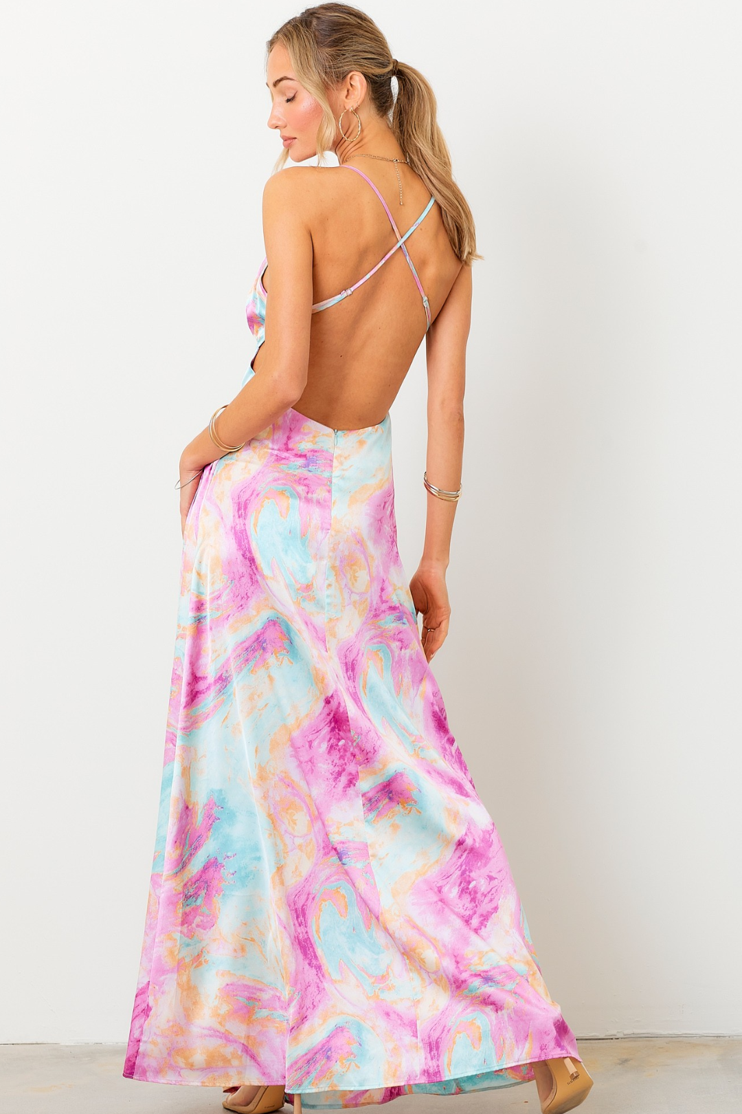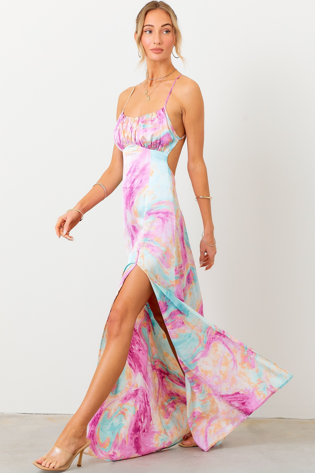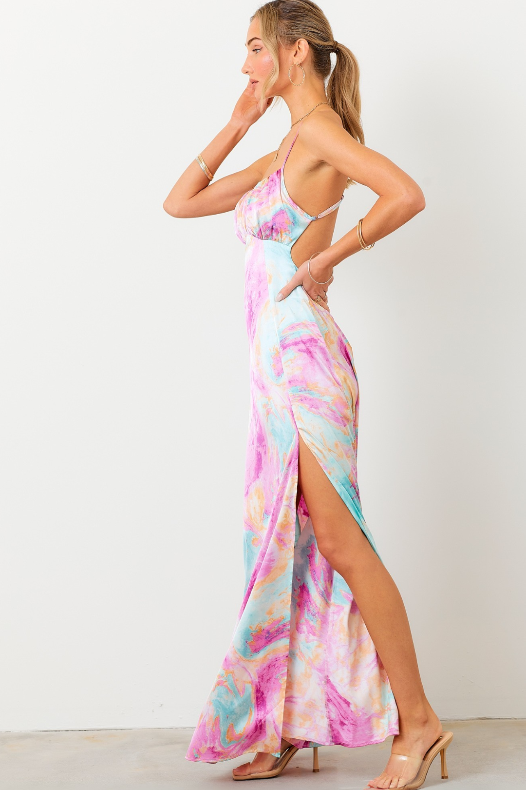 Soft hues, standout details. Show off your beauty in this elegant Tie Dye Maxi Dress. Designed with a flattering scoop neckline, adjustable spaghetti straps, a sultry side slit, and a bold criss-cross open back, it's the ultimate stunner dress. Perfect for romantic dates, beach dinners, and wedding events.