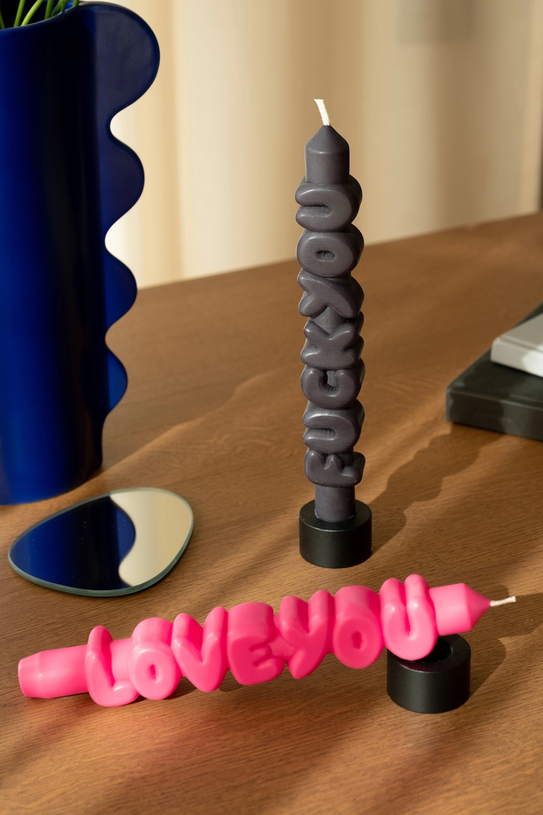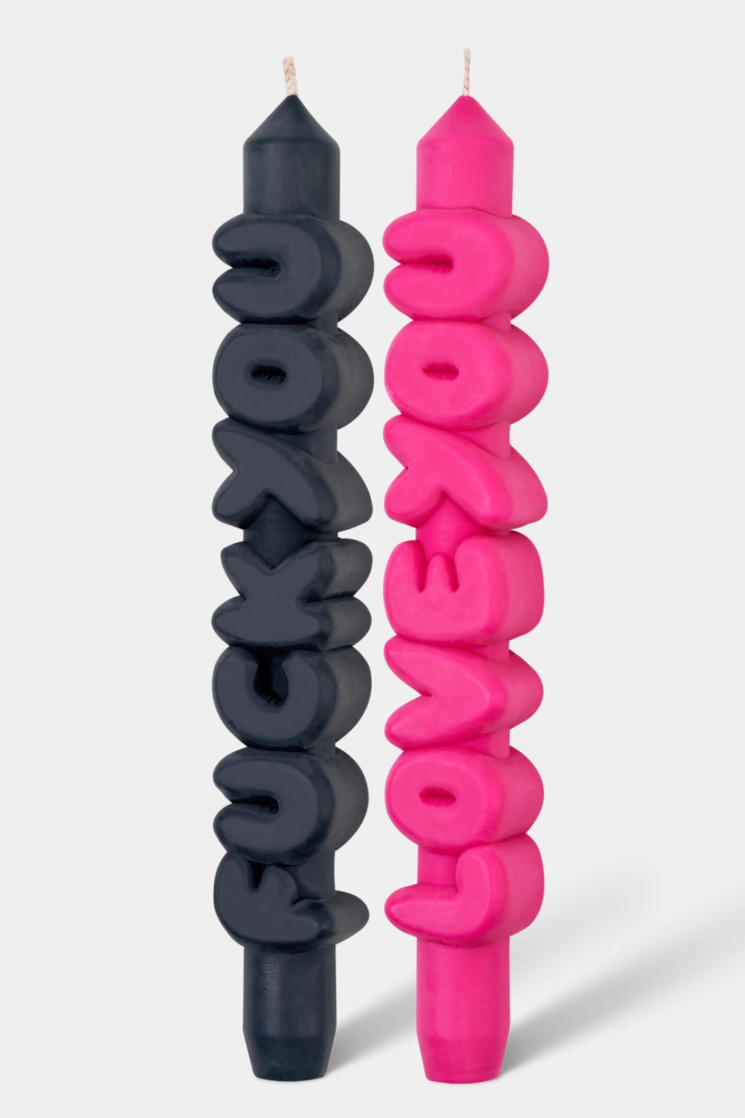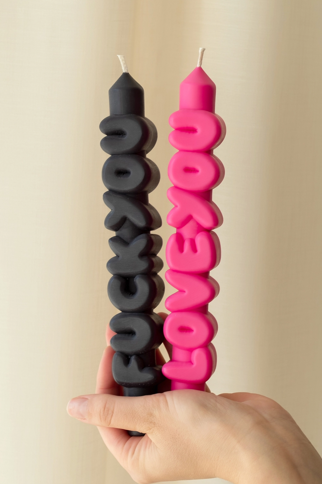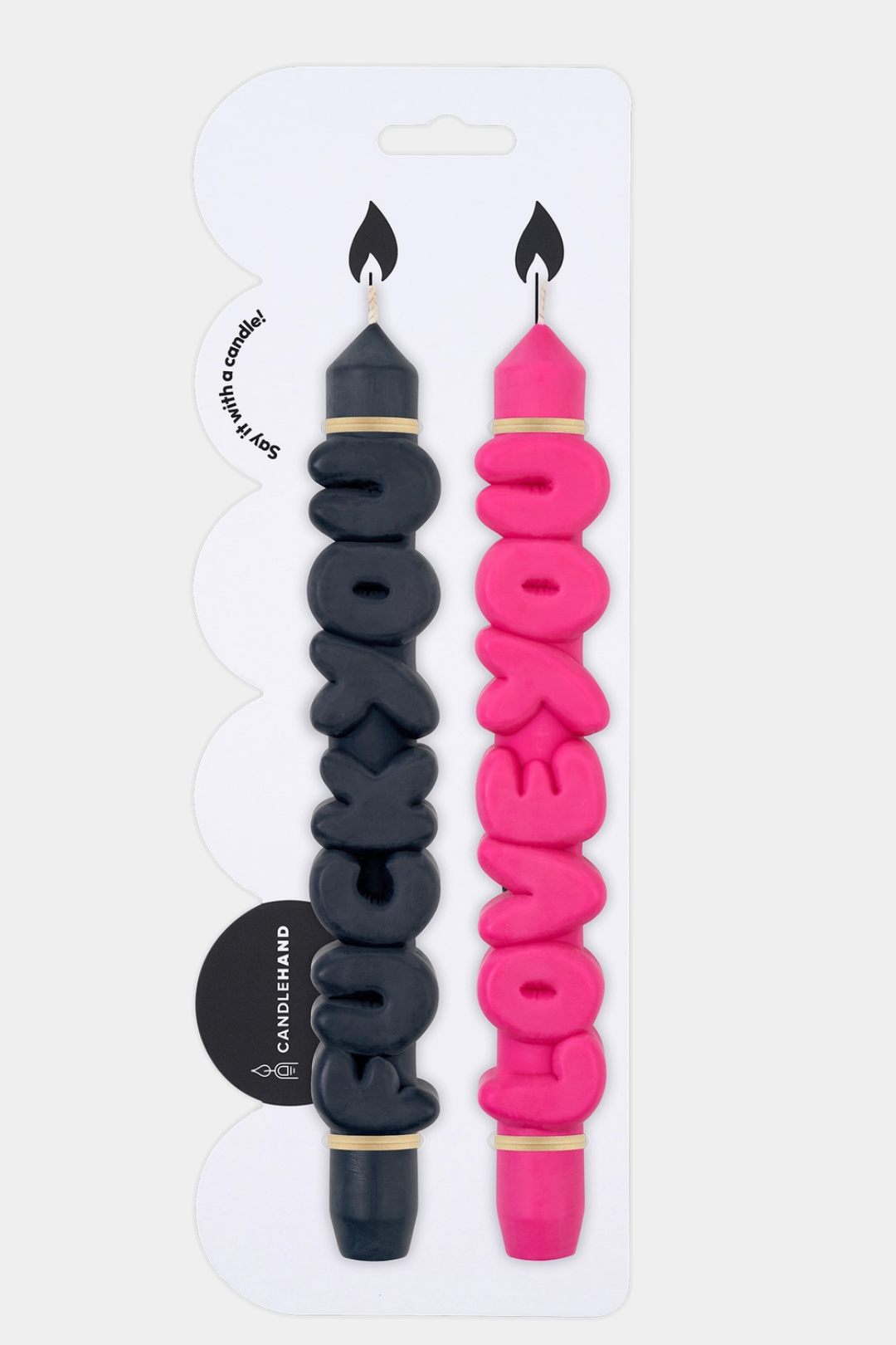 Two moods. One iconic set. Meet the ultimate emotional rollercoaster in candle form. Featuring one bold black "F You" candle and one pink "Love You" candle, this duo says everything you're thinking without saying a word. Handmade with sculpted 3D lettering and a sleek taper silhouette, these candles double as modern art and conversation starters. It's sass, sweetness, and statement decor all wrapped in one unforgettable set.
