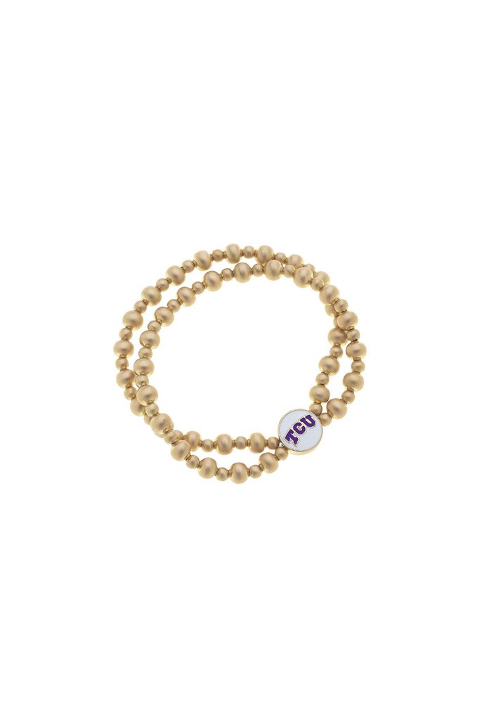 Stack on the spirit with this TCU Horned Frogs 2-Row Ball Bead Stretch Bracelet. Designed in a satin gold finish with the classic TCU logo charm, it's the perfect blend of sleek and spirited. The stretch fit makes it easy to wear, whether you stack it with your favorite gameday pieces or let it shine on its own.