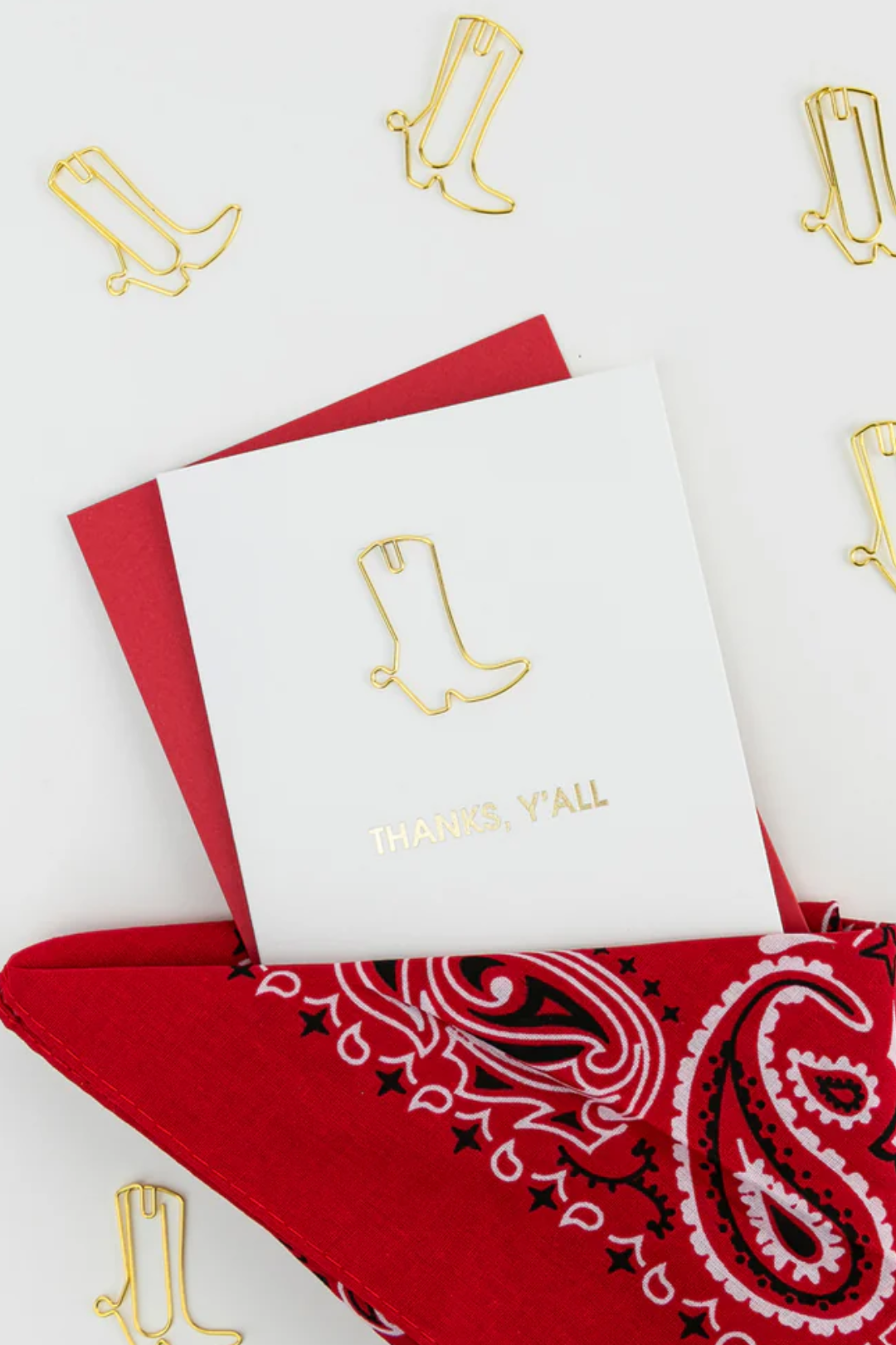 This thank you card keeps it sweet, stylish, and reusable thanks to the cutest cowboy boot paper clip detail. Clean white card, gold foil moment, and a bold red envelope—simple, thoughtful, and way more fun than a basic thank-you. Perfect for thank-you notes, host gifts, bridesmaids, teachers, coworkers, clients, or anyone who deserves a little extra appreciation.