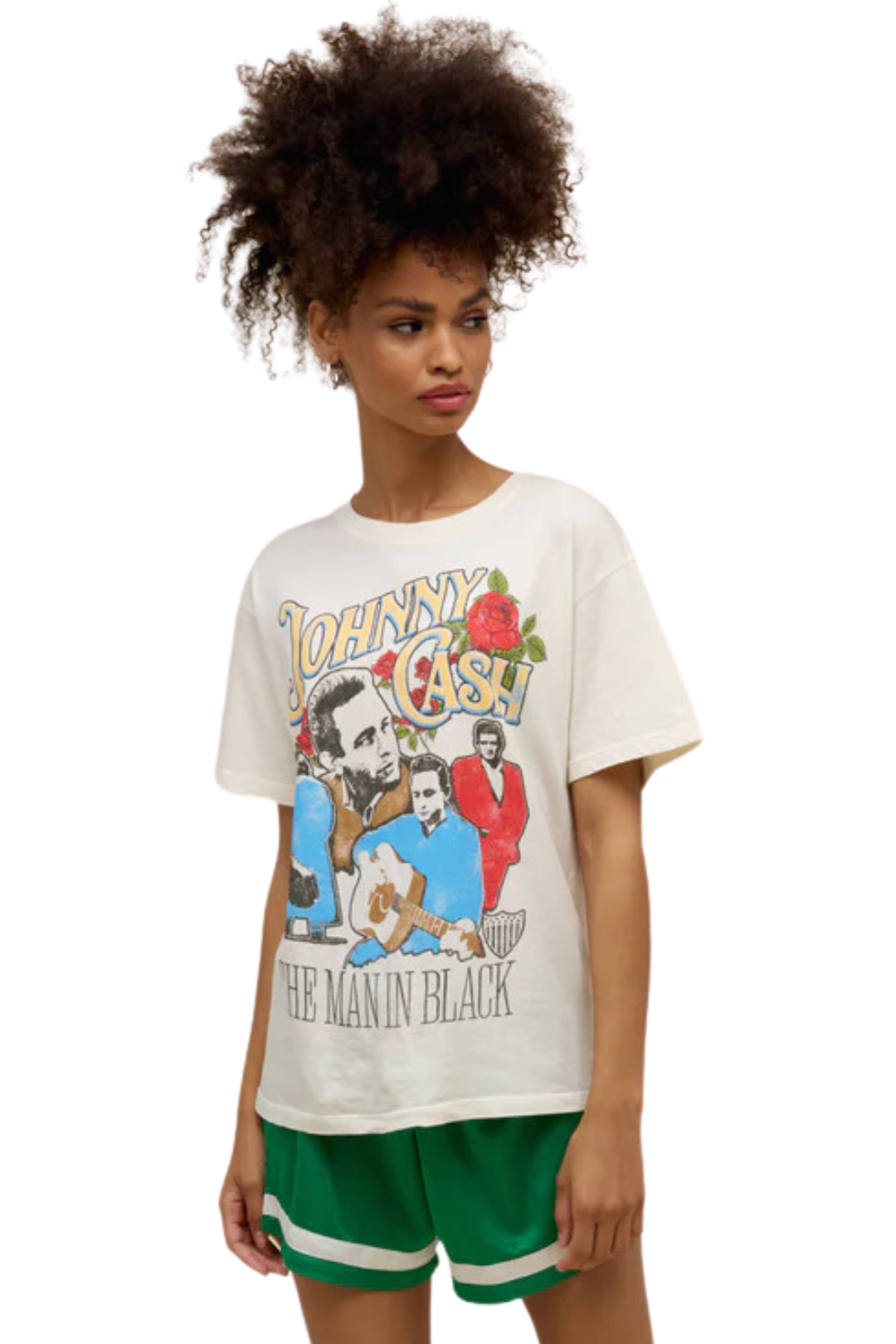 Get ready to rock out in style with the Daydreamers’ bestselling Johnny Cash A Man Comes Around Boyfriend Tee. This comfy tee has slightly dropped shoulders, an open neckline, and a slouchy lived-in look. It is adorned with portraits of Johnny Cash and pink roses. Wear it to run errands, go on weekend trips, or just for a casual day out.