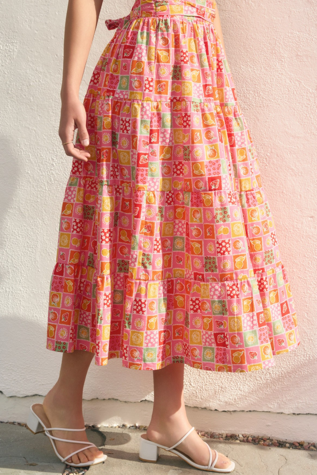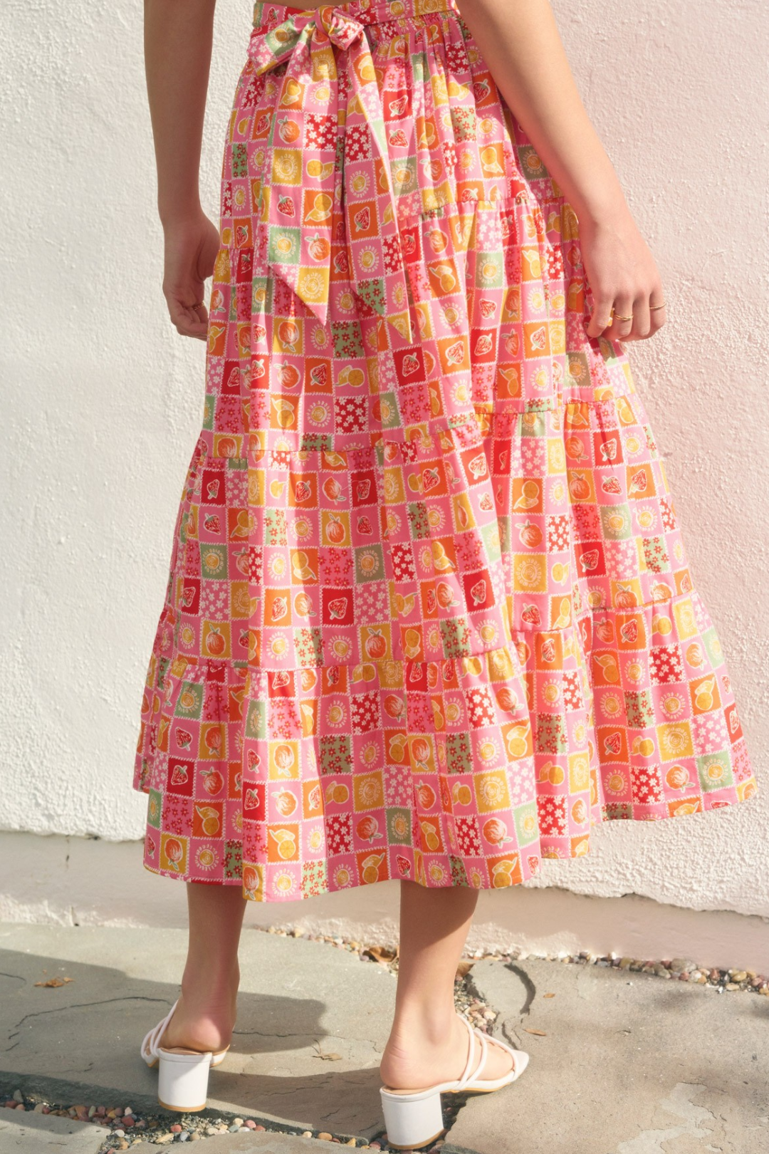 Tiered, tied, and totally twirl-worthy. This Fruit Skirt is serving sunshine with every step. Featuring a juicy fruit print, this skirt flows with a breezy tiered silhouette. The tucked waistband detailing and sash tie closure add a polished touch, while the smocked back ensures a comfy, flexible fit. Perfect for summer picnics, beach boardwalks, or dressing up for sunny days.