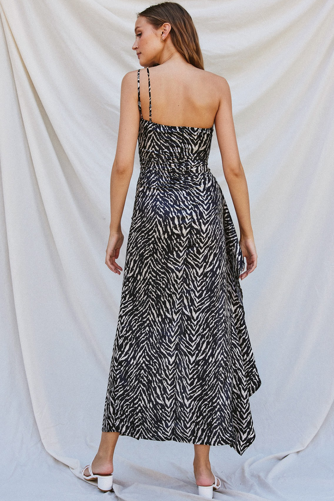 Make a bold entrance in the OFS Zebra Maxi Dress. This statement piece features an animal print with a one-shoulder style, adjustable spaghetti straps, a ruched waist, a hidden back zipper closure, and a daring ruffled slit. Whether you're headed to a summer party or a night out, this dress turns heads from every angle.