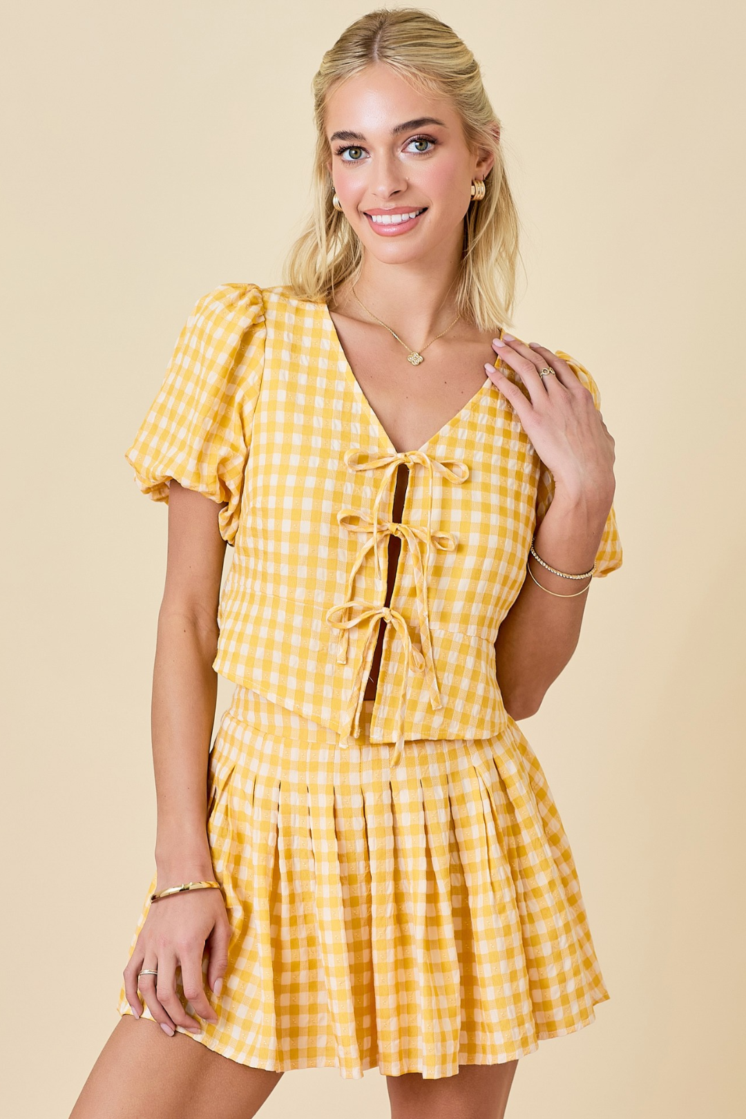 Charming and feminine, the Gingham Bow Skirt is the perfect piece to complete any outfit. It's a textured gingham with an elastic waist and pleated detail. Whether you're heading to brunch or a day out, this blouse is a must-have for effortless style!