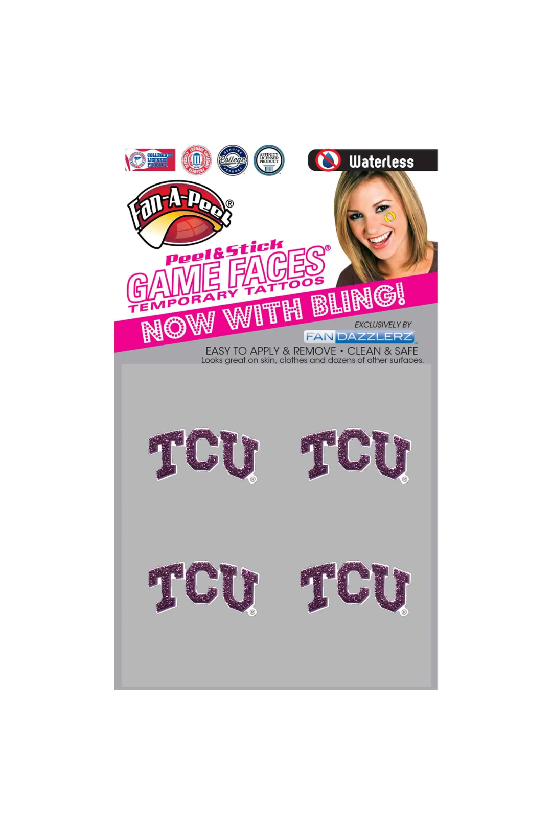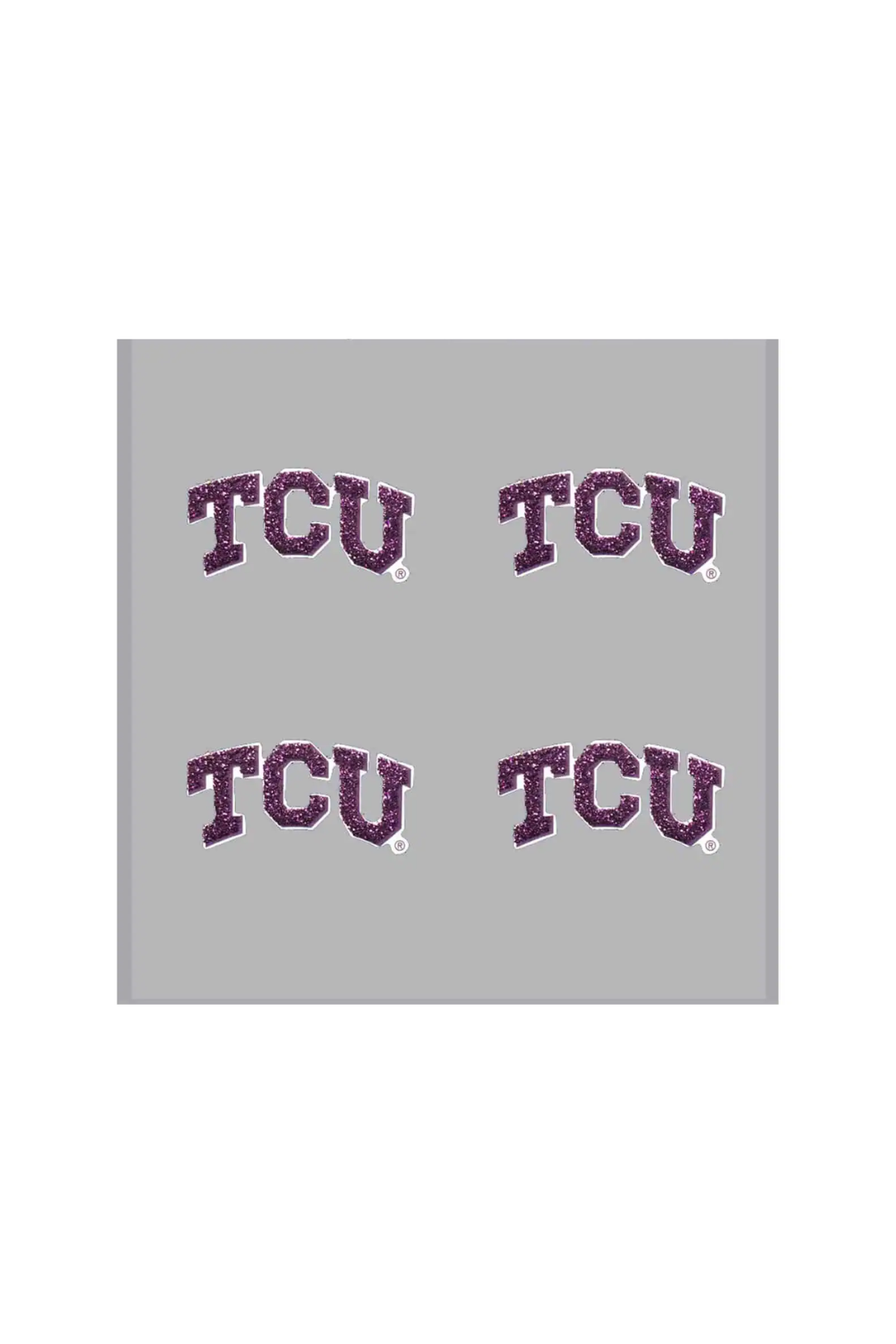 Show off your Horned Frog pride in sparkling style! These TCU Glitter Tattoos are the perfect game day accessory. Each package includes 4 waterless peel and stick temporary tattoos—no mess, no fuss, just bold team spirit. Designed with glittery details that catch the light, they're easy to apply and remove, making them great for fans of all ages.