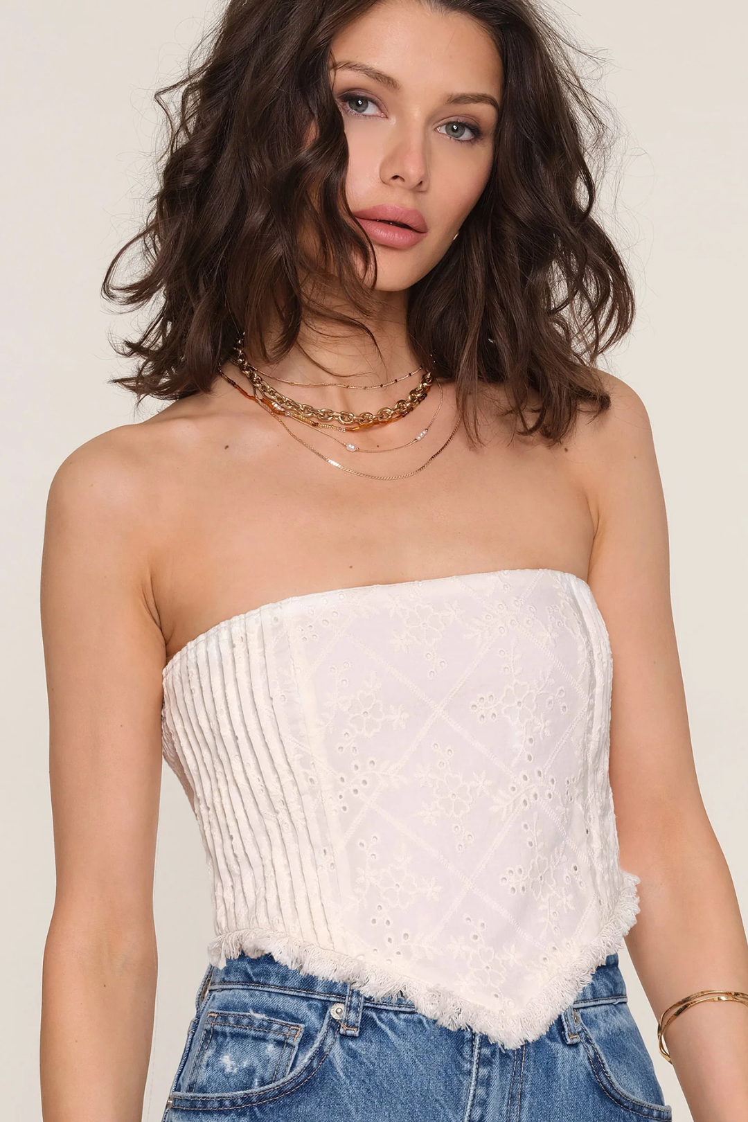 Romantic and effortless, the Carla Top is your go-to piece for elevated warm-weather styling. Crafted from delicate embroidered eyelet fabric, this strapless silhouette features soft pleating at the sides and a pointed, handkerchief-style hem for a flattering fit. The perfect mix of sweet and structured, it's a staple you'll style on repeat. Perfect for summer dates, rooftop drinks, festival looks, or coastal getaways.
