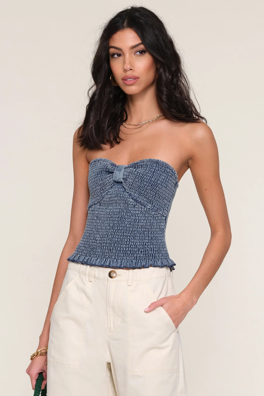 Meet your new summer staple: the Miska Top from Heartloom, a flirty-meets-fitted silhouette crafted from soft, breathable denim. Designed with a slim fit and a fully smocked bodice, it hugs in all right places while still feeling easy and comfortable. A delicate bow detail at the front neckline adds a sweet touch, making this the kind of top you'll reach for again and again. Perfect for summer festivals, day dates, weekend brunches, and vacay looks.