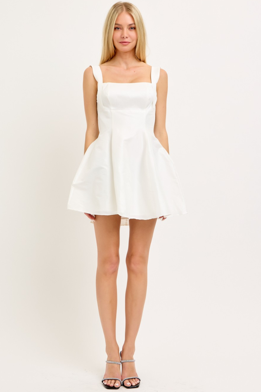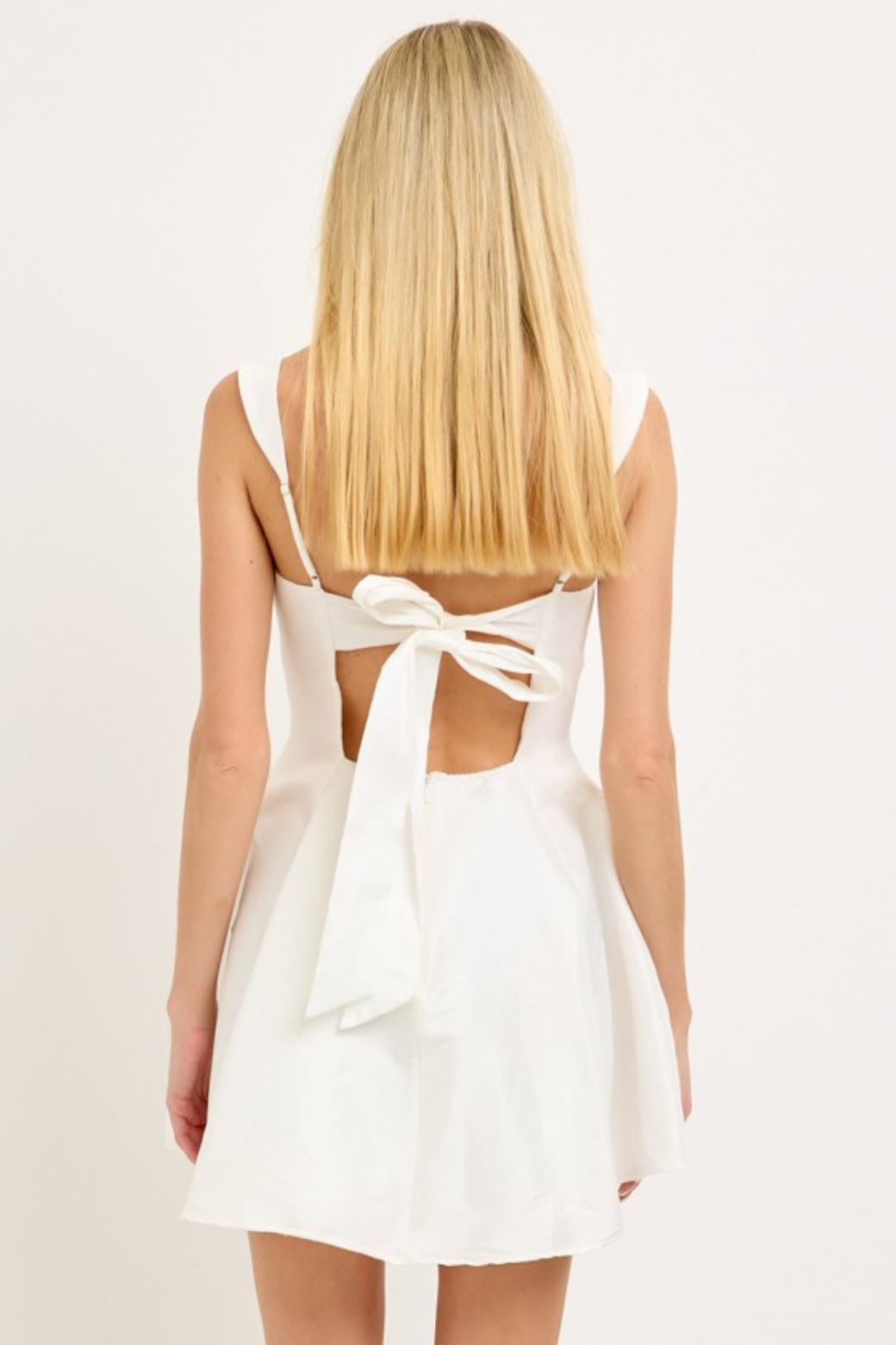 Introducing the dreamy hourglass silhouette Bow Back Jenny Dress in white. With a flattering square neckline, gathered bust, and flared mini skirt, it brings the twirl factor, while the open back with a statement bow makes sure you turn heads from every angle. Perfect for romantic dates, summer parties, bridal showers, or any moment you want to feel like that girl.