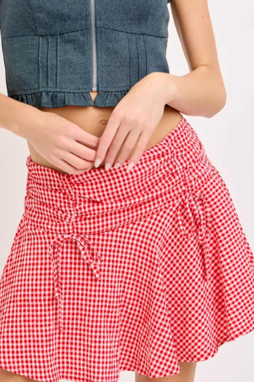 It's giving picnic-core but make it hot. This low-rise mini Gingham Skirt gives instant main character vibes with its bold red gingham, flirty flare shape, and cutest bow front detail. Whether you're twirling through summer or throwing on a baby tee and sneakers, this skirt is your new crush.