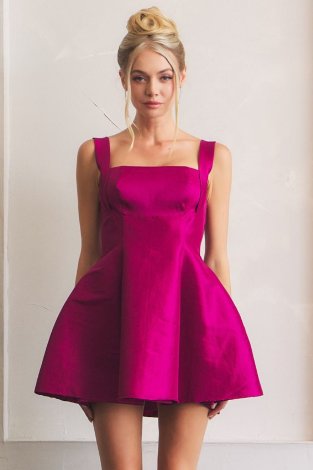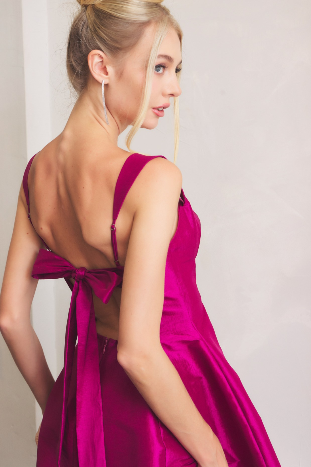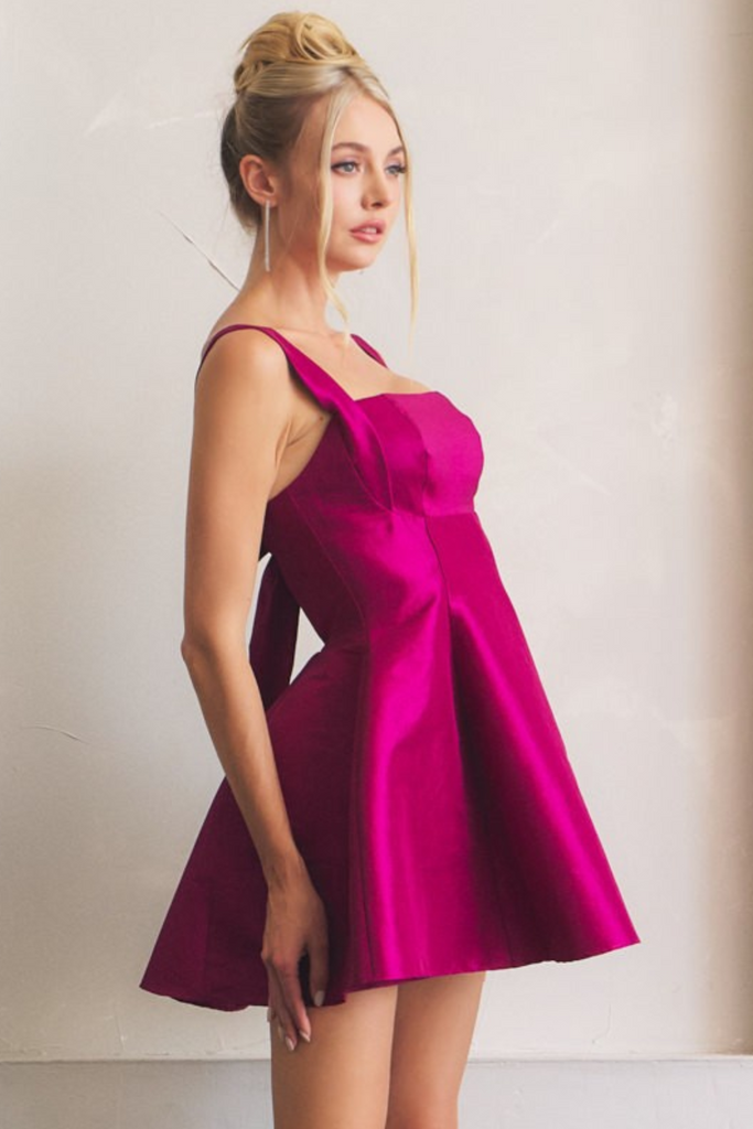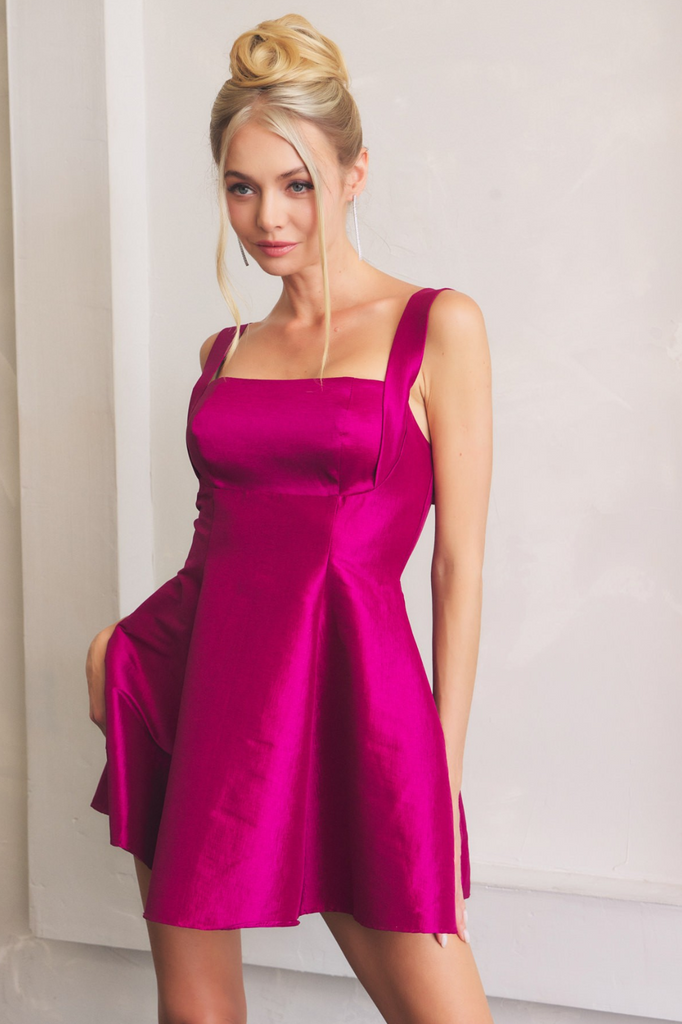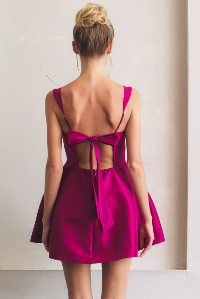 Made for spotlights and evenings that deserve to be remembered, this Satin Dress blends flirty charm with festive flair. The gathered bust shapes a feminine neckline, while the hourglass fit and flared skirt keep it playful and dance-ready. Turn around and you'll find the real showstopper—a tie-back cutout that adds just the right touch of drama. Perfect for birthday parties, holiday celebrations, or New Year's Eve countdowns.