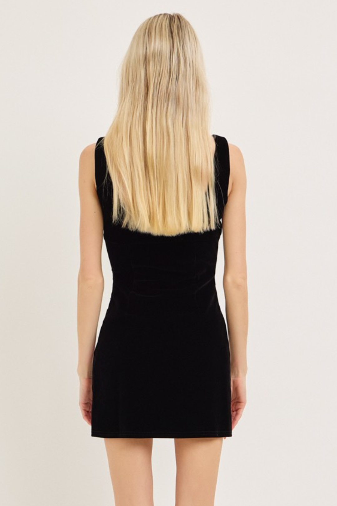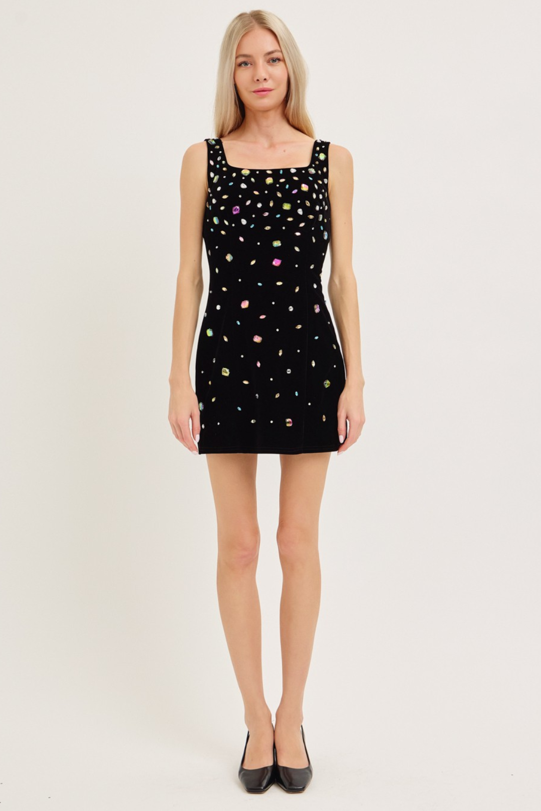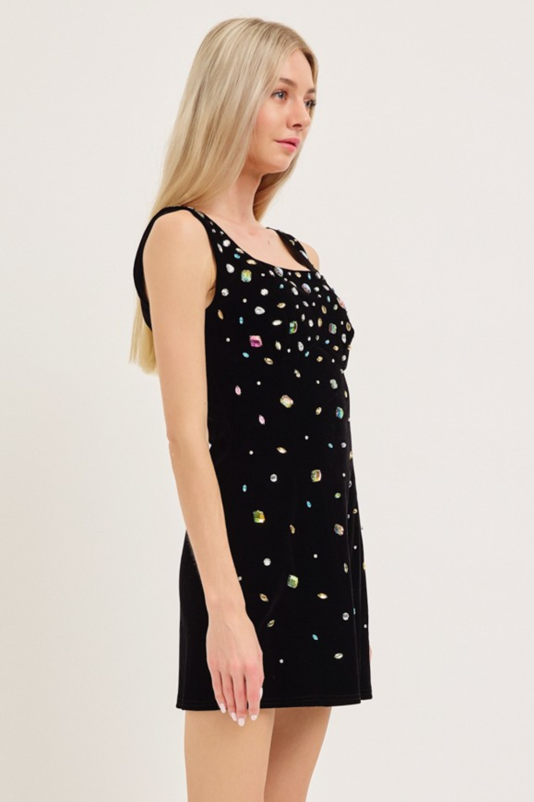Make an entrance with this eye-catching Velvet Jewel Dress. The soft black velvet is sprinkled with multicolor jeweled studs that catch the light and give the dress that fun, luxe sparkle. The square neckline keeps it clean and flattering, while the mini length brings flirty energy. Perfect for holiday parties, birthday nights out, or girls' dinners.