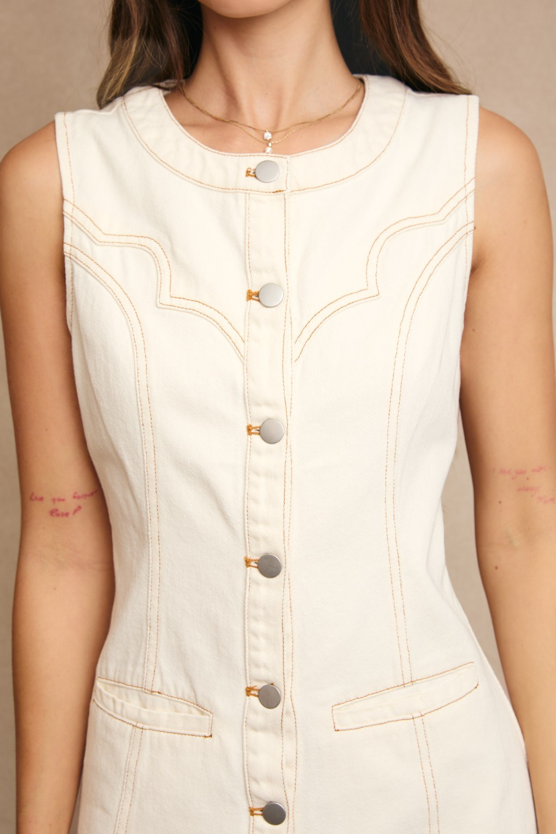 The Hook 'Em Denim Dress isn't your average denim piece. In a soft cream hue with contrast stitch detailing, it keeps the classic denim attitude but lightens it up for warmer days. The button-down front and sleeveless cut make it easy, breezy, and just structured enough to wear from brunch to rooftop. Perfect for weekend coffee runs, summer festivals, casual date nights, or vacation city exploring.