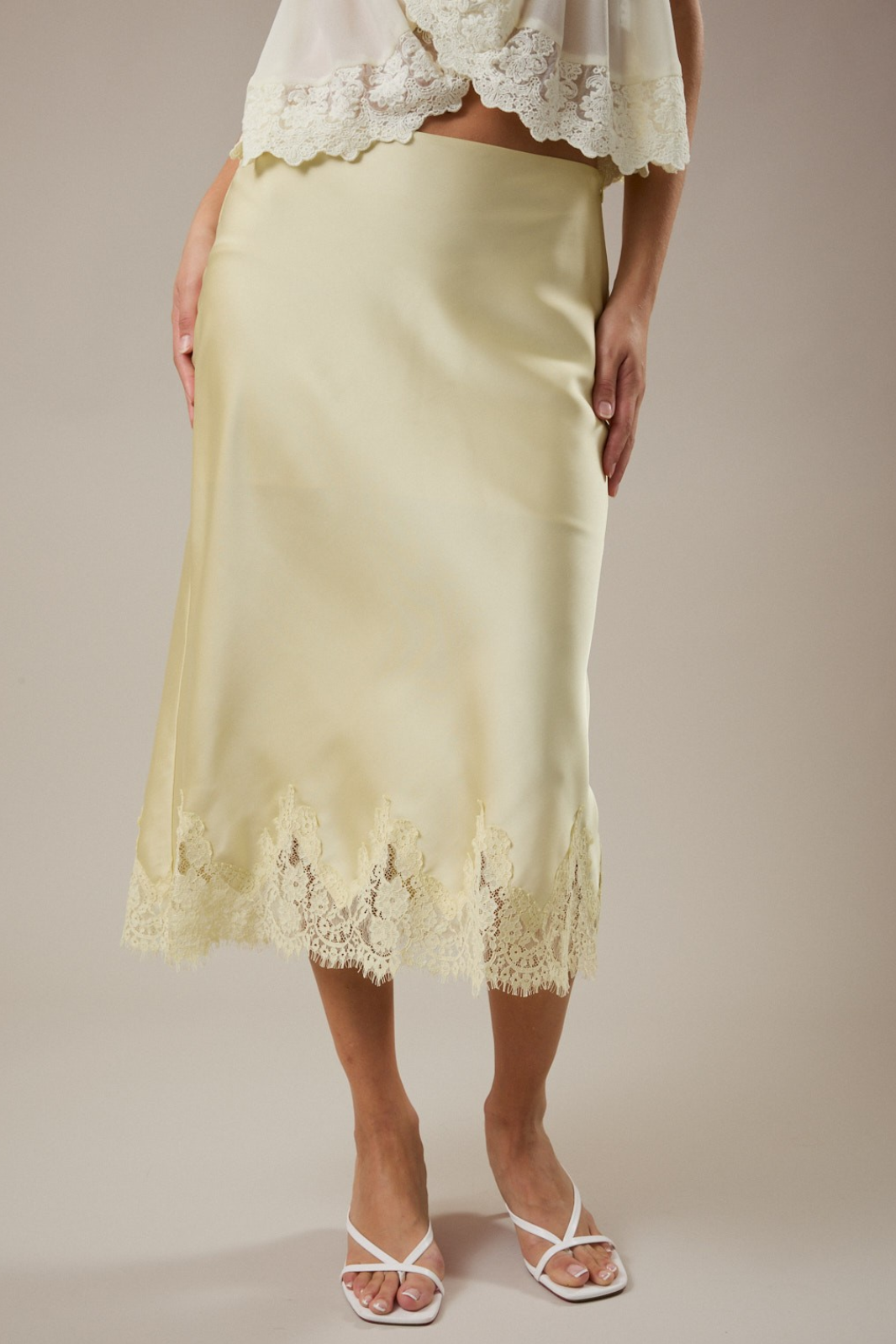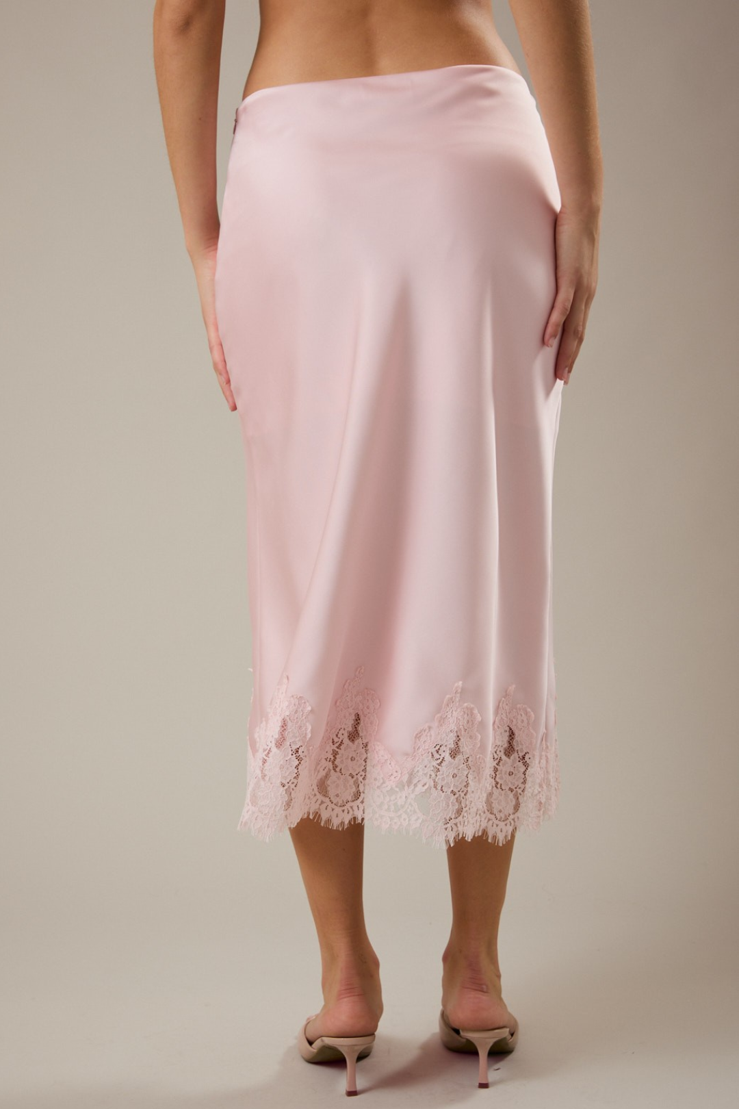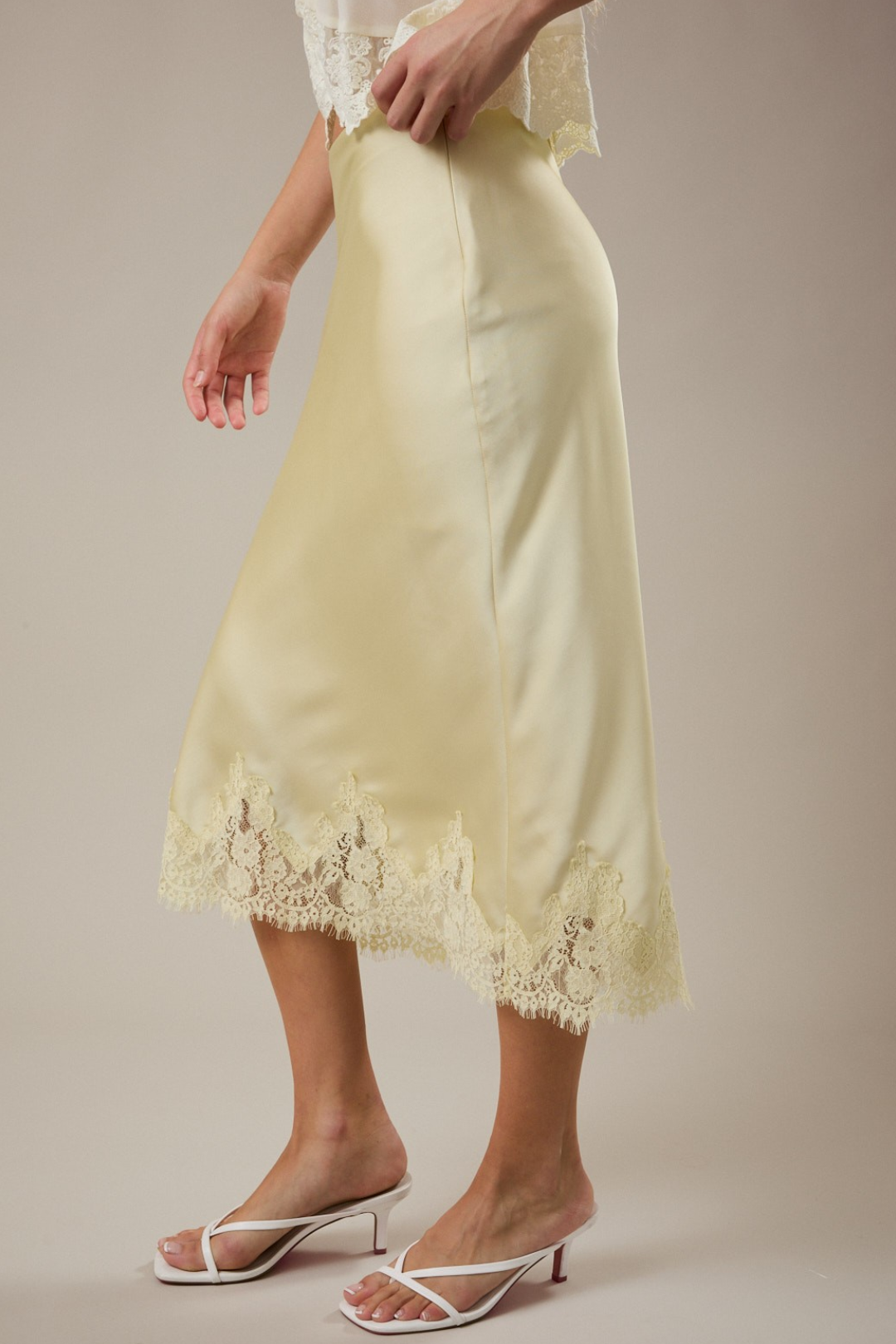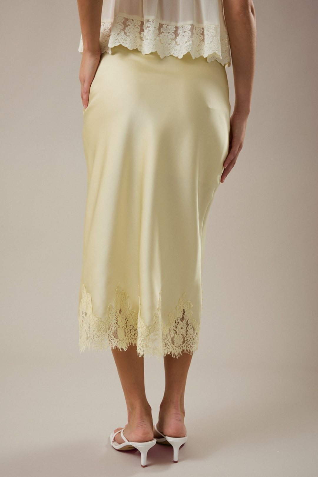 Soft, romantic, and effortlessly elevated. This Lace Midi Skirt is that luxury piece your wardrobe's been waiting for. Cut on the bias for a smooth, body-skimming drape and with delicate lace detail at the hem that adds a feminine finish. It's the kind of skirt that moves beautifully and photographs even better. Perfect for date nights, bridal events, brunch with the girls, vacation dinners, spring weddings, or elevated everyday styling.