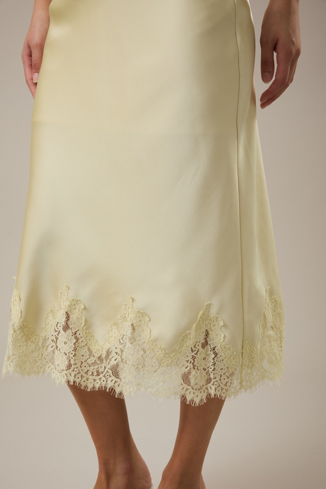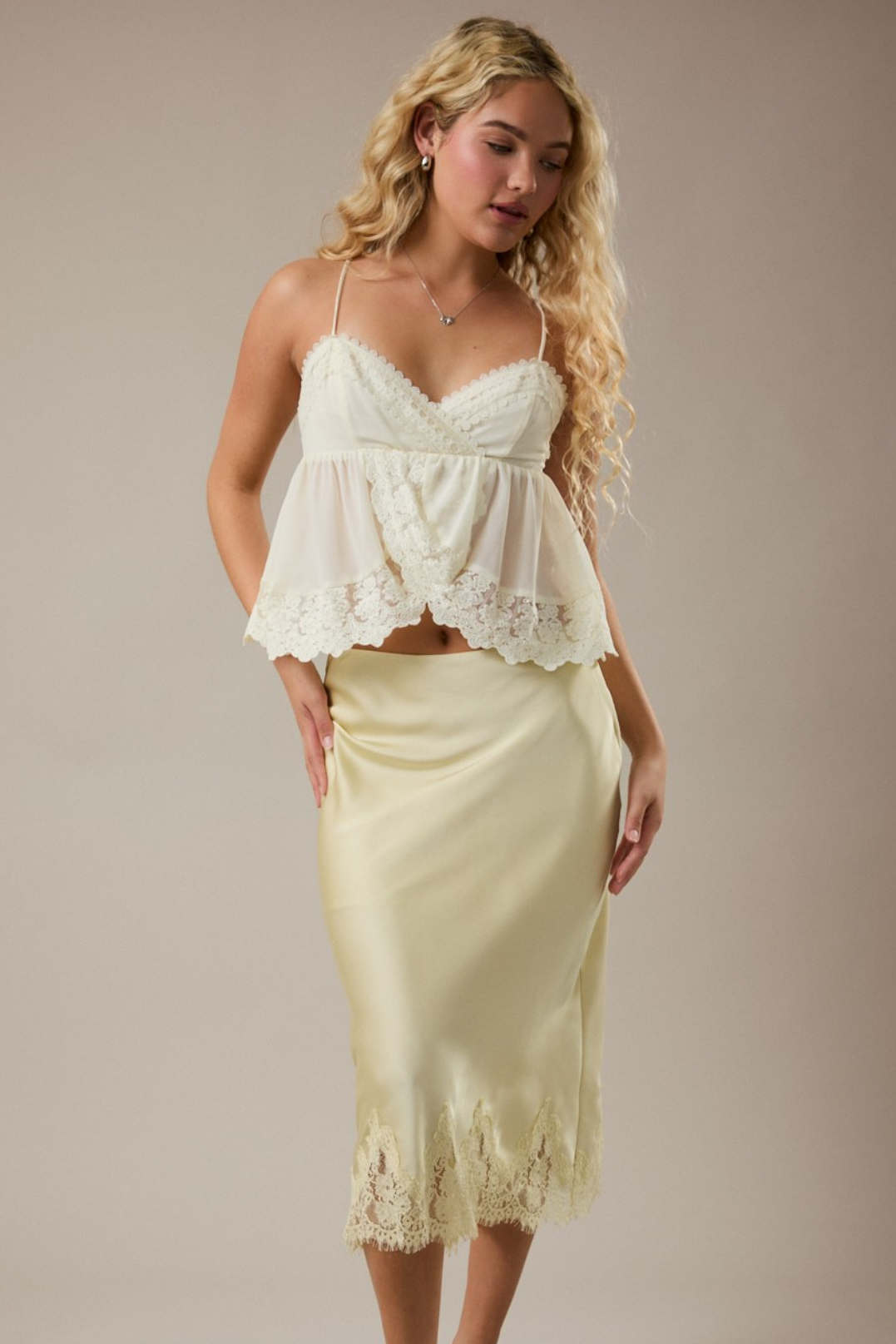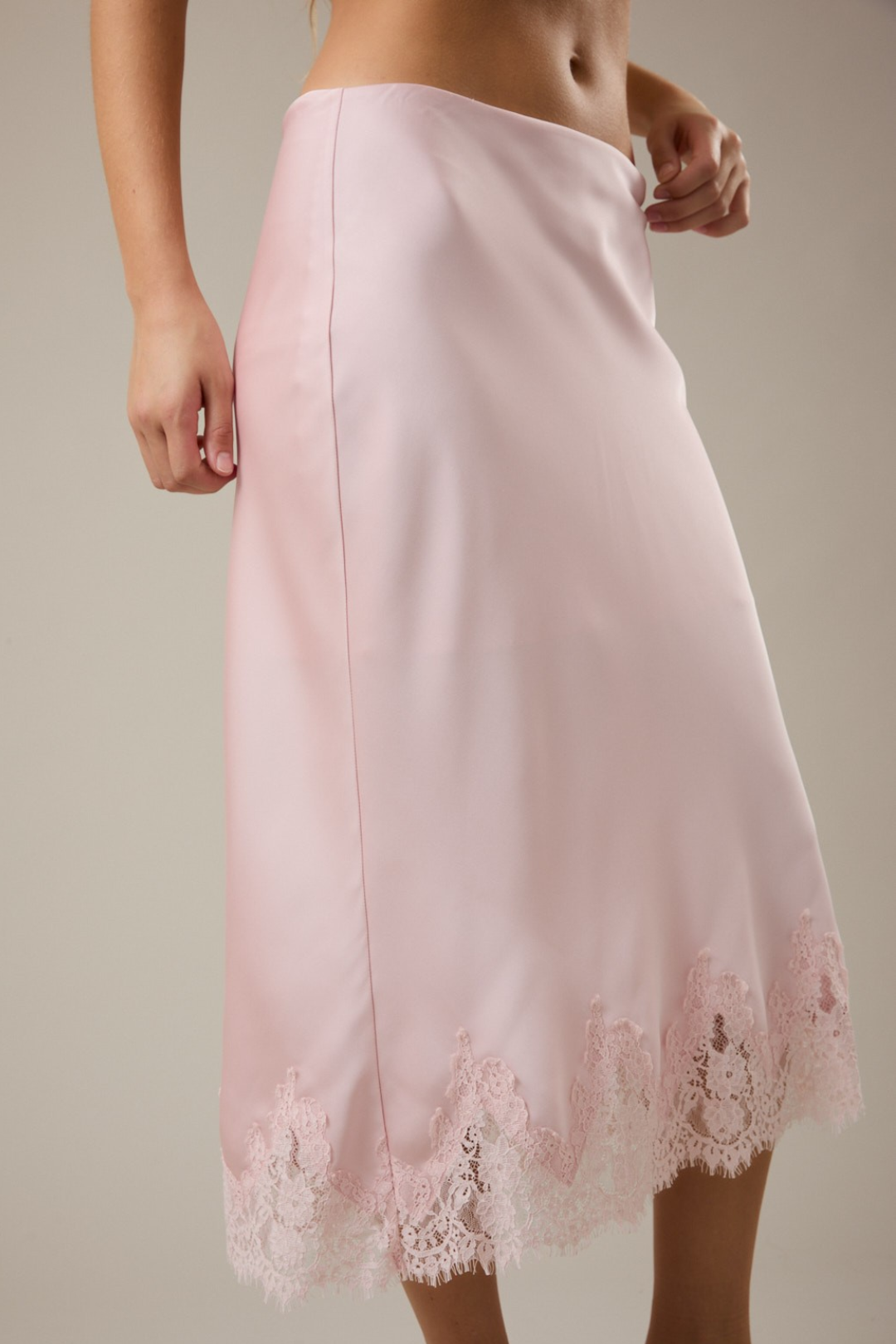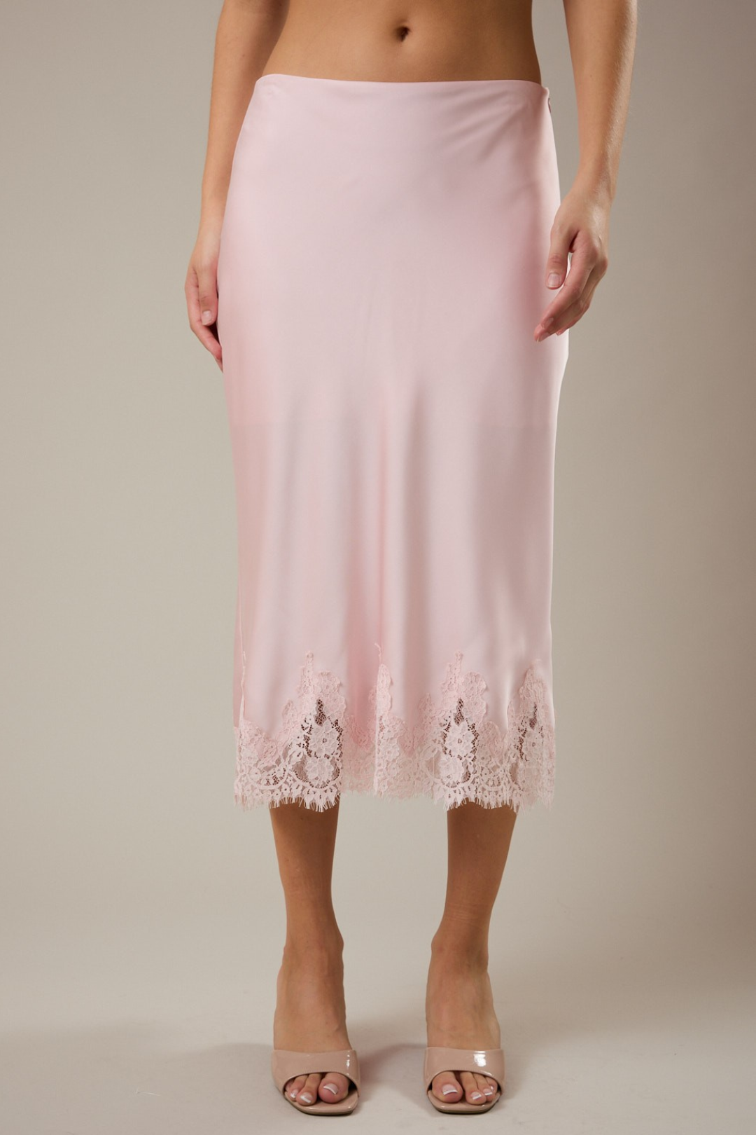 Soft, romantic, and effortlessly elevated. This Lace Midi Skirt is that luxury piece your wardrobe's been waiting for. Cut on the bias for a smooth, body-skimming drape and with delicate lace detail at the hem that adds a feminine finish. It's the kind of skirt that moves beautifully and photographs even better. Perfect for date nights, bridal events, brunch with the girls, vacation dinners, spring weddings, or elevated everyday styling.