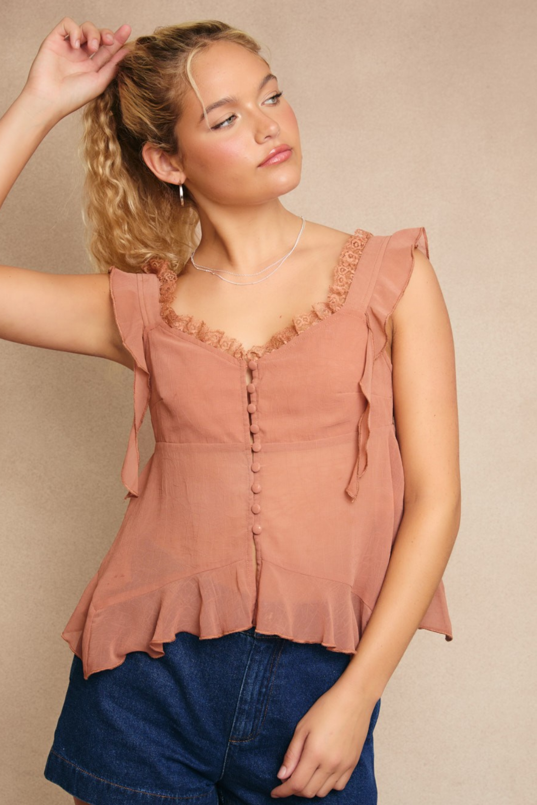This Texas Shootout Top gives that soft-girl moment wherever you go. Featuring flutter sleeves with cascading ruffles and fabric-wrapped buttons. Perfect for brunch, vacation, or casual nights.