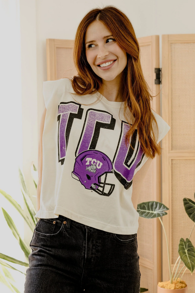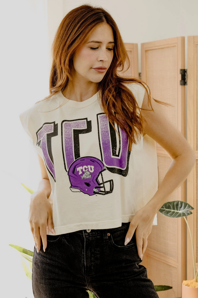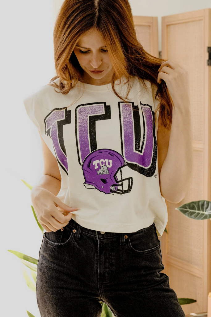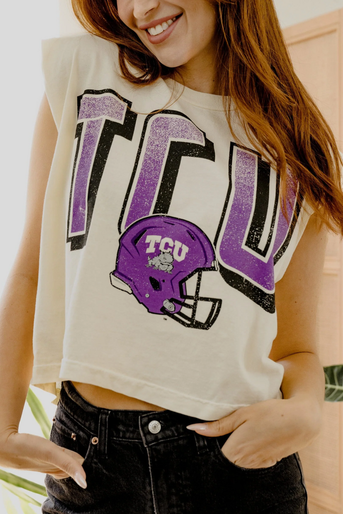 The TCU Horned Frogs Helmet Fade Out Muscle Tee brings that vintage thrifted vibe with a modern edge. Garment-dyed for a soft, worn-in look, it features a boxy, slightly cropped fit with raw-edged sleeves, a wide rib collar, and all-day comfort details like taped neck and shoulders with a tear-away label. Perfect for gamedays, tailgates, or laid-back weekend looks.