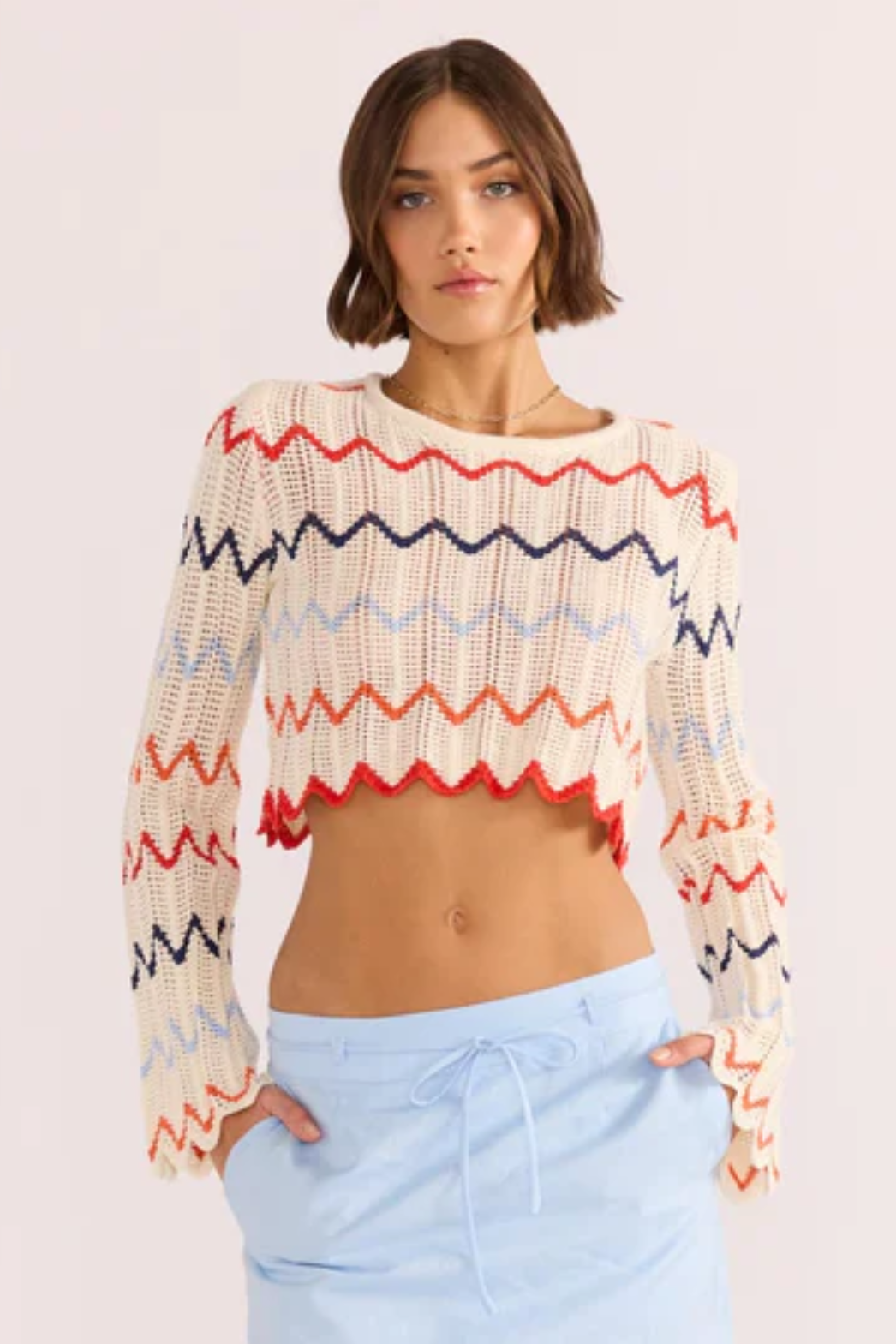 Introducing the Calliope Knit Crop Top—a playful and attention-grabbing way to update your wardrobe. Featuring bold horizontal zigzag stripes in vibrant red, orange, and blue on a light beige background. This piece brings a fun vibe to any ensemble, whether you're dressing down or up.