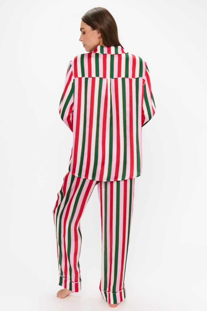 Meet this Classic PJ Set in Jolly Stripes Silky, bringing holiday cheer straight to your bedtime routine! These silky PJs are made for cozy nights and merry mornings around the tree. The button-down top and relaxed elastic-waist bottoms keep comfort effortless while still serving holiday-cute energy. Perfect for holiday movie marathons with hot cocoa, family Christmas photos, present unwrapping, or gifting to your favorite cozy queen.