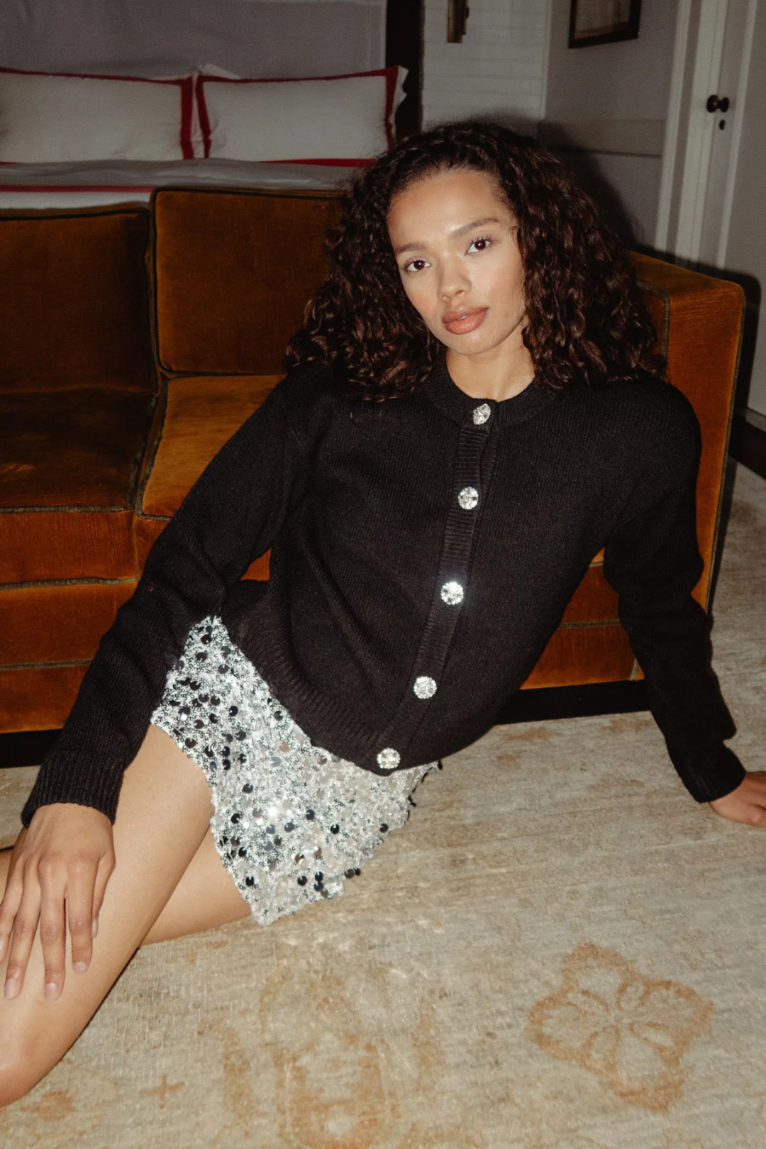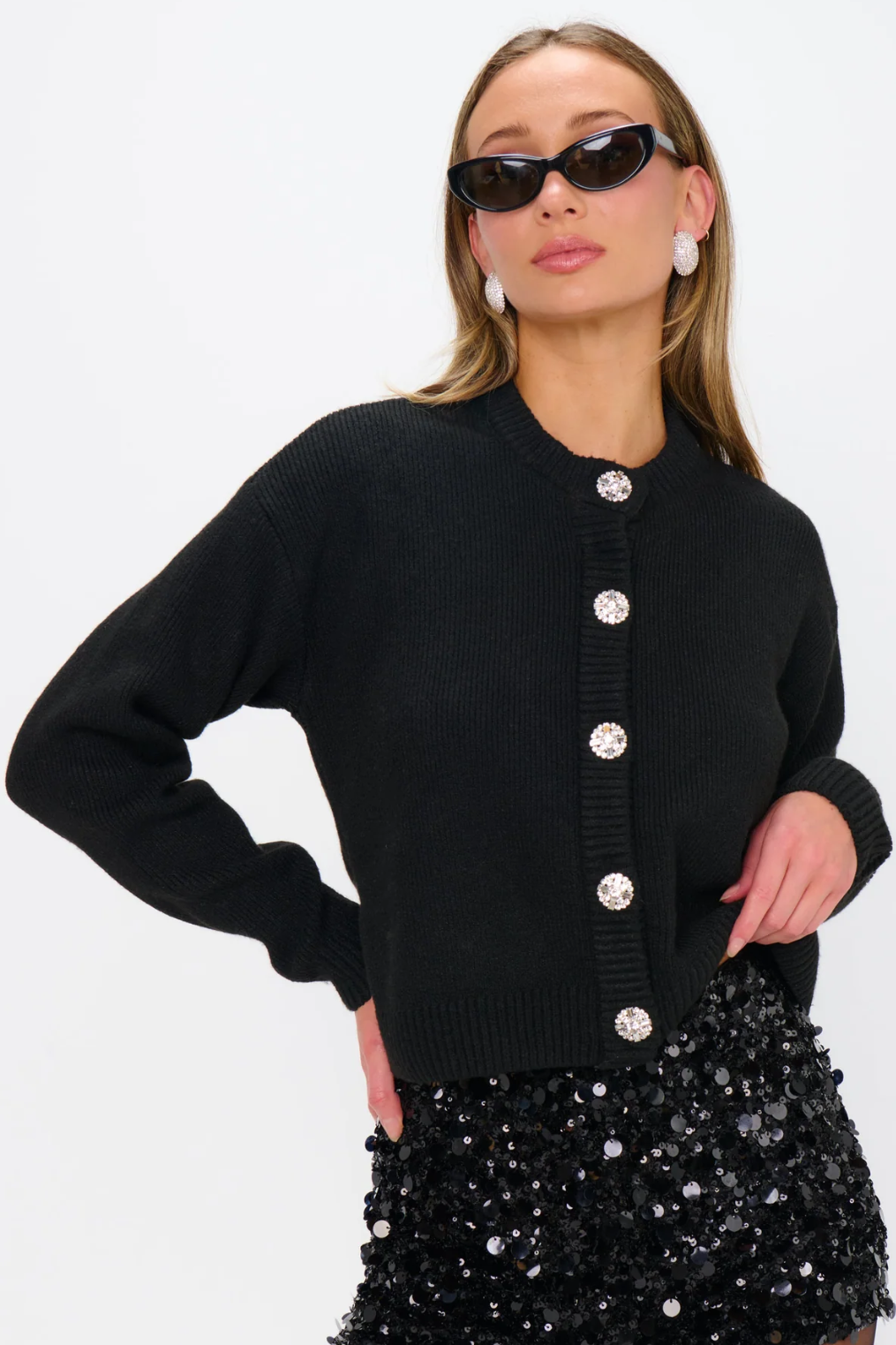 Your classic black cardi—now with a glam upgrade. The Maggie Cardigan keeps it effortlessly chic with soft knit fabric and oversized rhinestone buttons that add a little sparkle to your every move. Whether you're dressing it down for daytime or giving your night-out fit that extra shimmer. Perfect for dinner dates, nights out, or casual chic days when you want a little sparkle in your step.